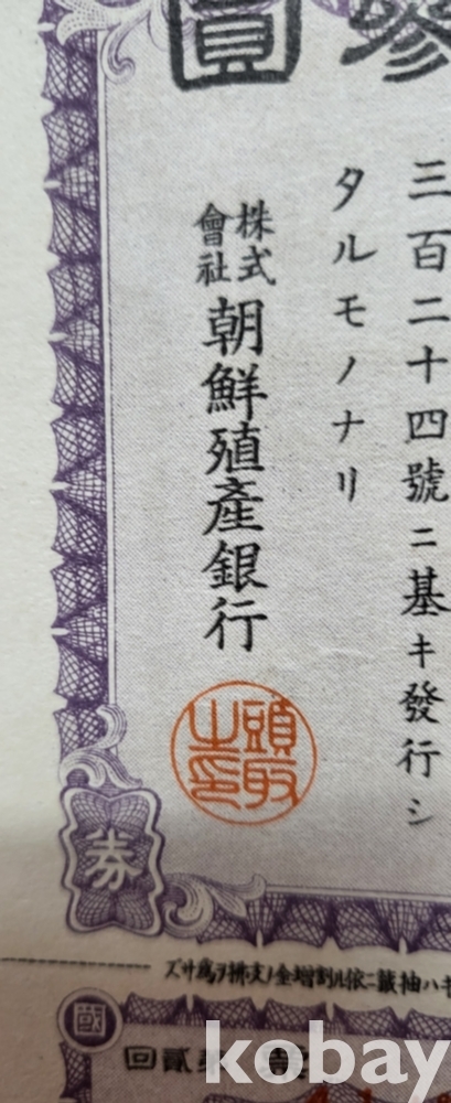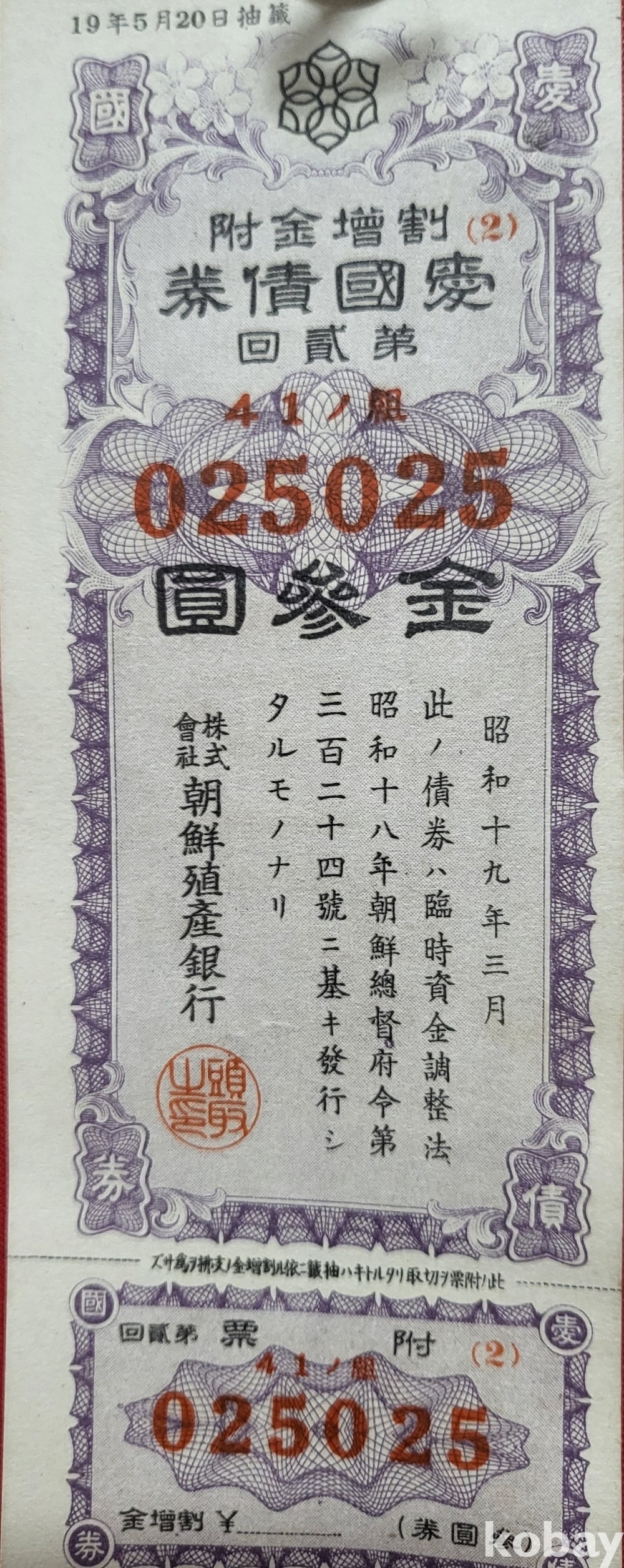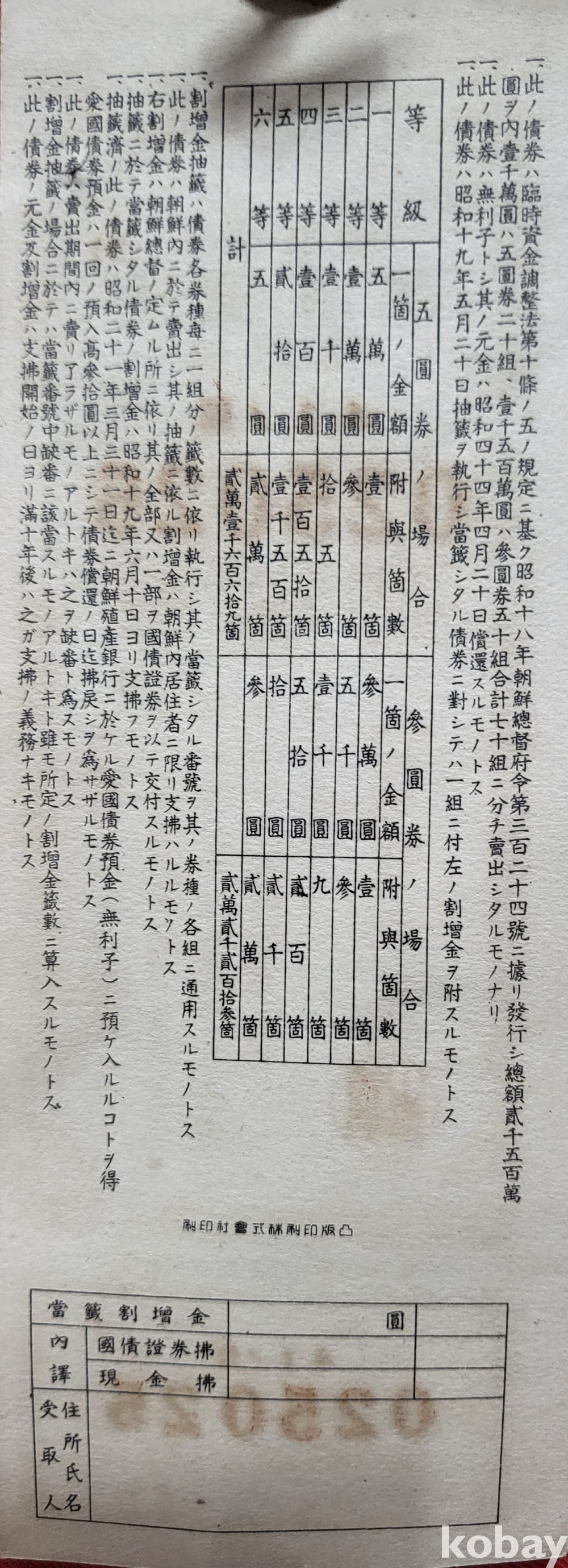 주식회사 조선 직산은행 소하19년(1943년) 발행된 할증금부(割增金附)입니다,
