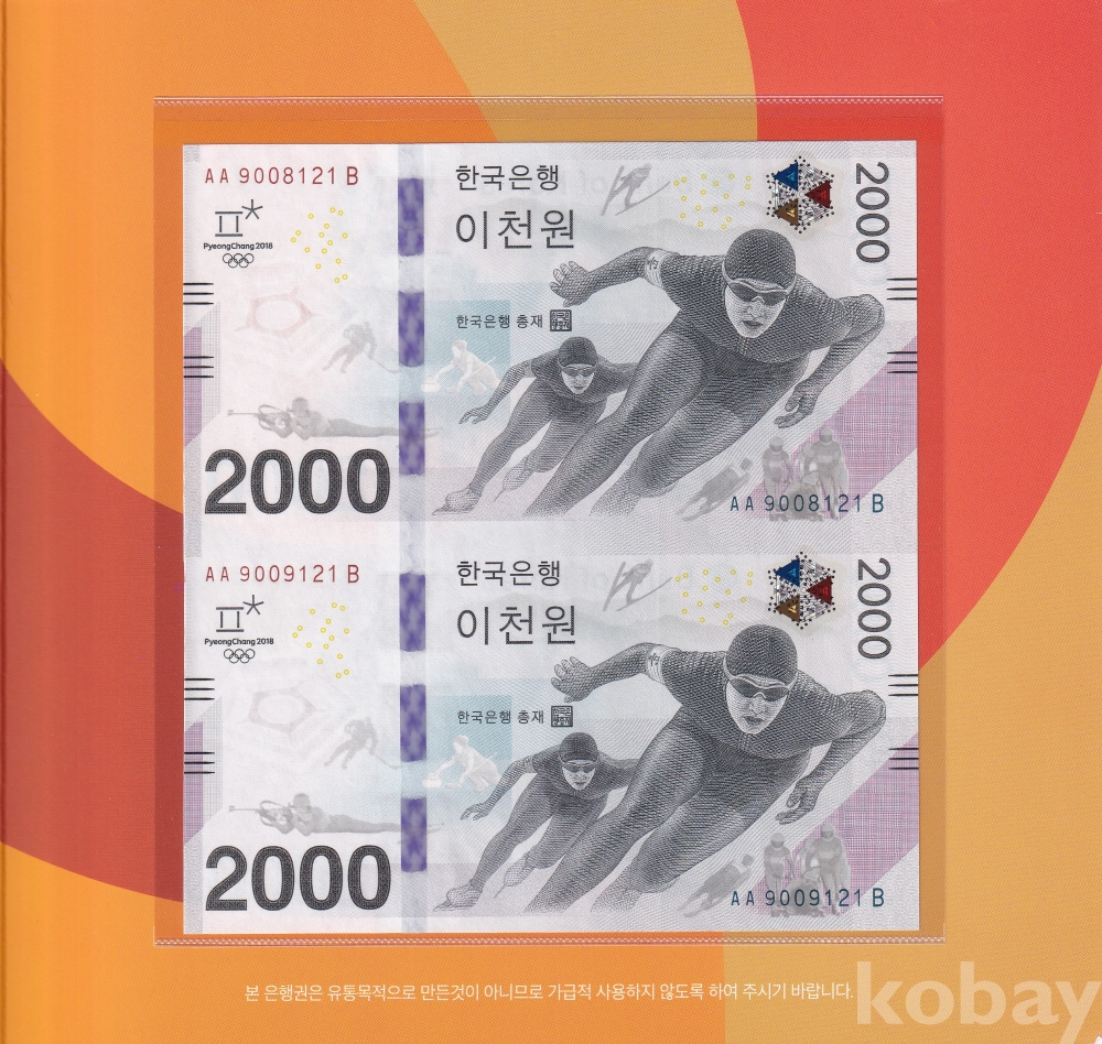- 2018년 평창 올림픽기념 2,000원 초판 AAB 9008121 / AAB 9009121 - 2연결권 미사용 지폐 입니다.