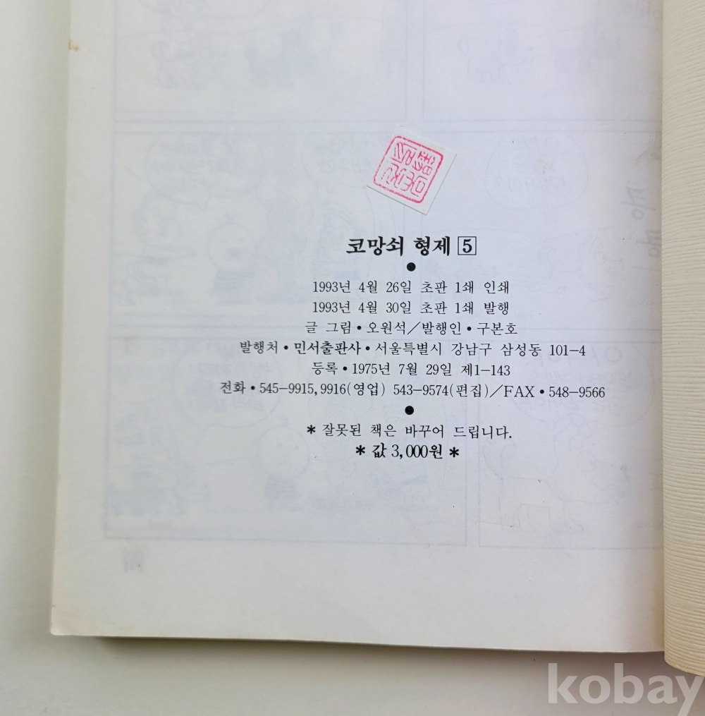 물 품 명 | [명량만화] 오원석 / 코망쇠 형제(5) / 소년동아일보 인기연재만화 / 1993년 초판 / 민서출판사 |