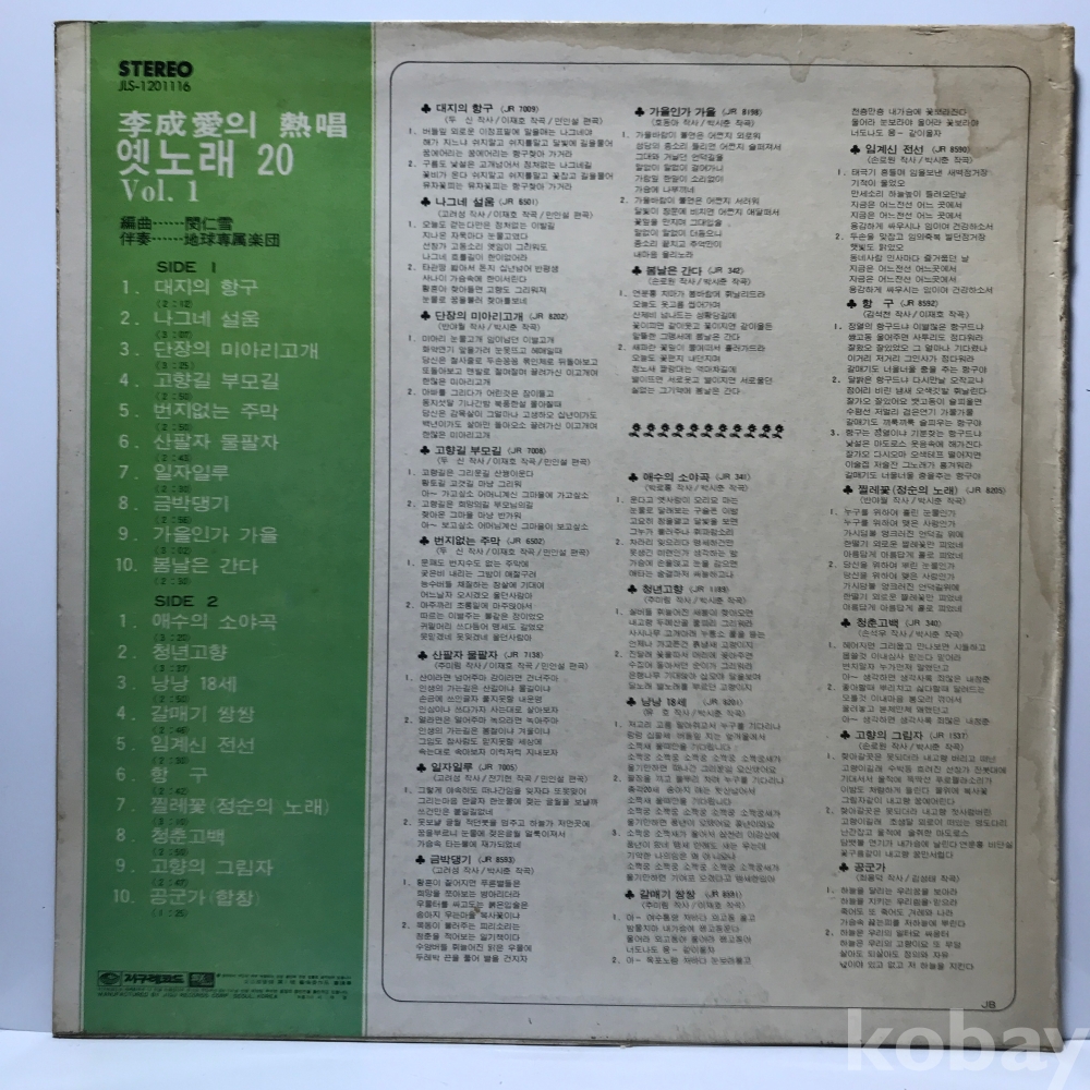 LP 36,150-31 이성애 옛노래 20 - 대지의 항구/ 애수의 소야곡 . 78 지구 자켓 EX 알판 EX+