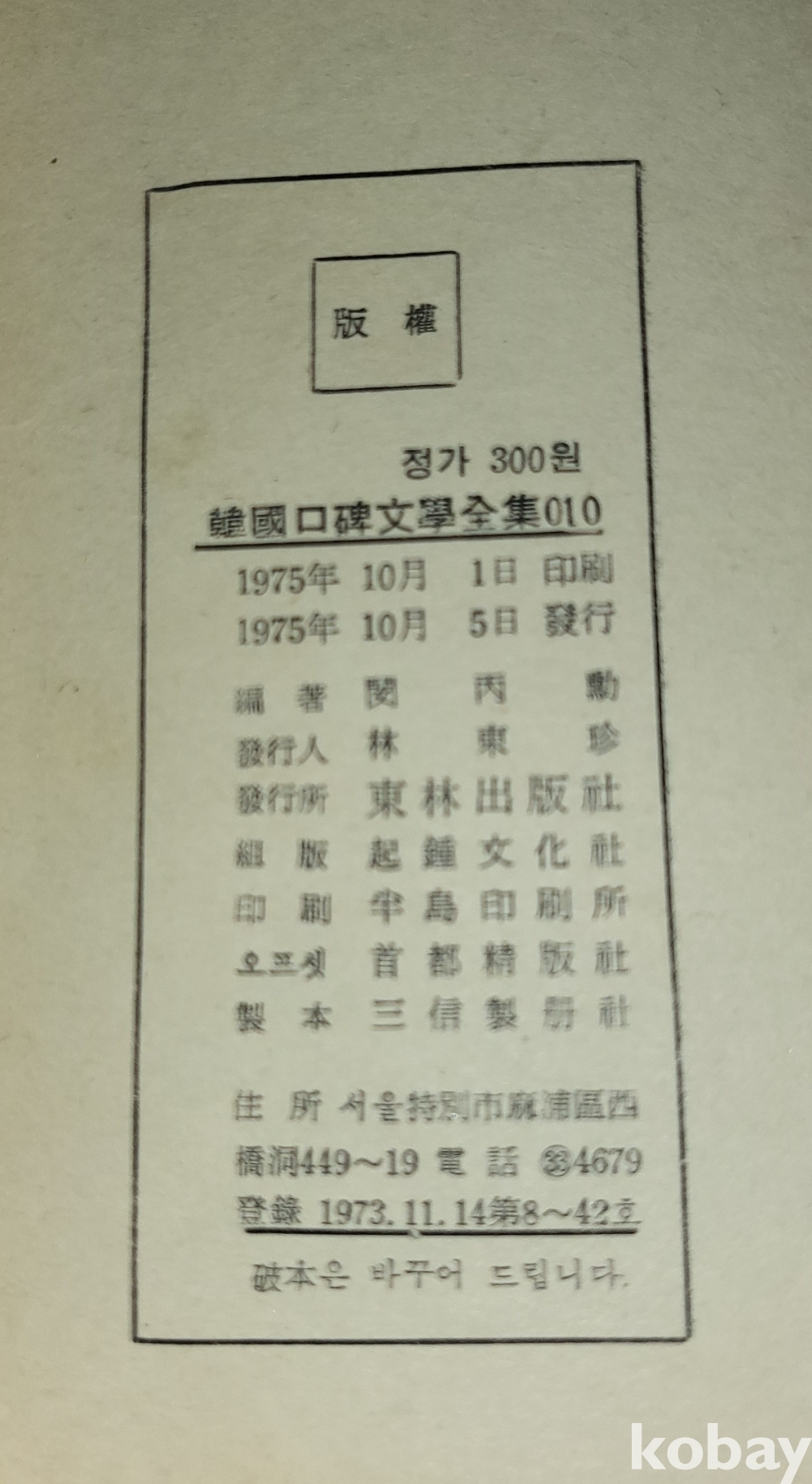 50년 전에 발행된 책으로 노후감과 탈색이 보임니다,