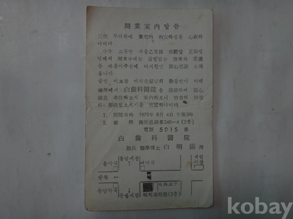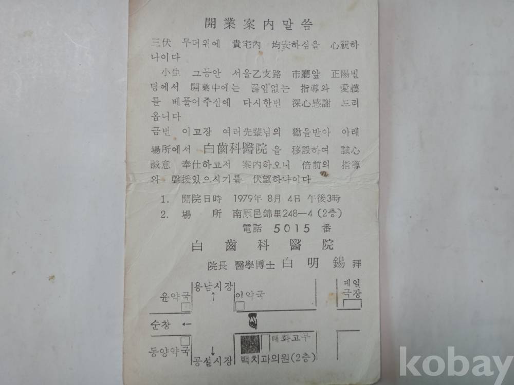 남원읍 - 백치과의원 개업 안내말씀 (1979년, 의학박사 백명석)