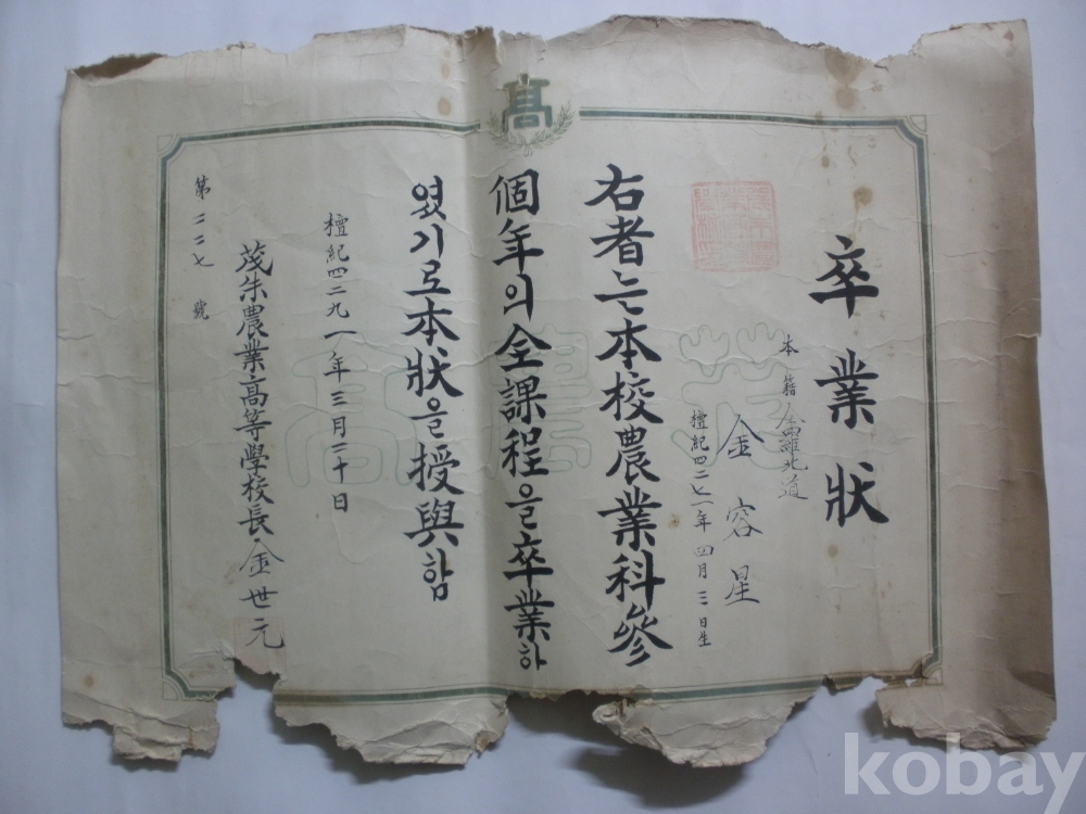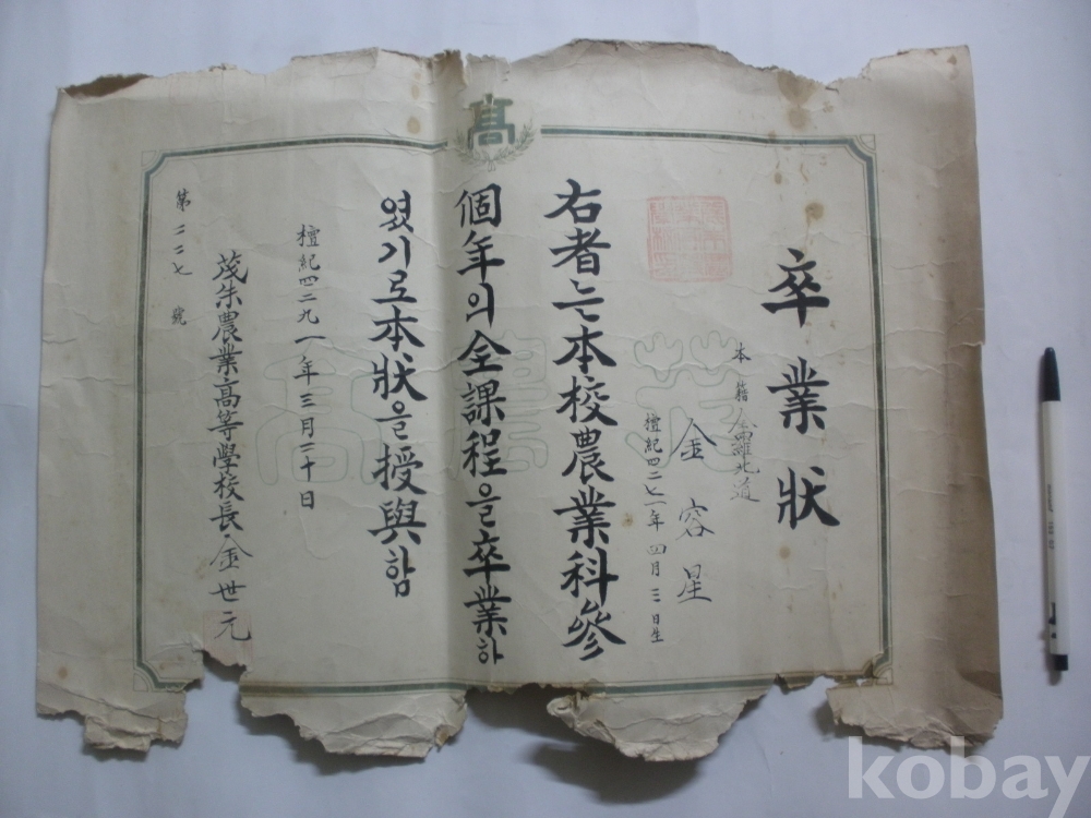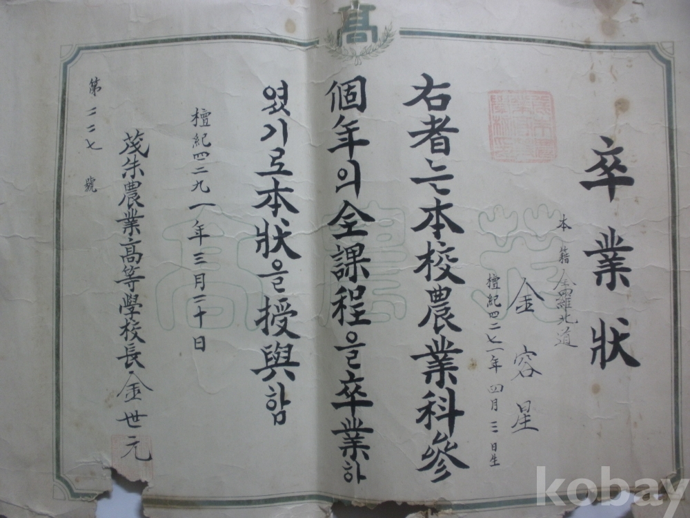 무주 농업고등학교 졸업장 (1958년)