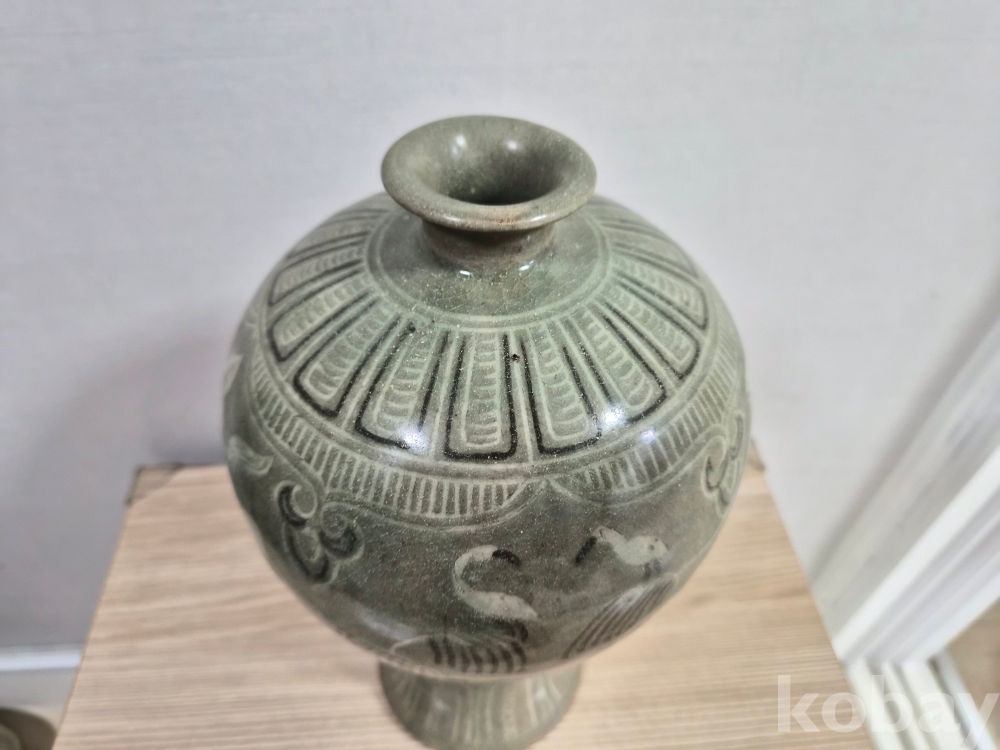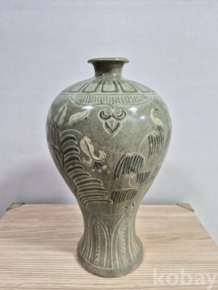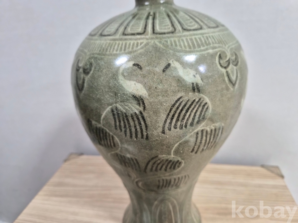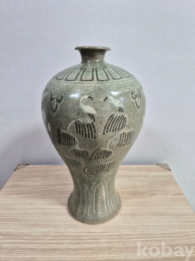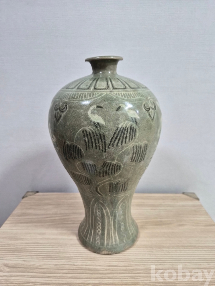 청자흑백상감 수류문에 학두마리가가지위에나란히 양면으로 마주보고있고 그리고특히한 화문이 양면으로 잘 시문되어있습니다