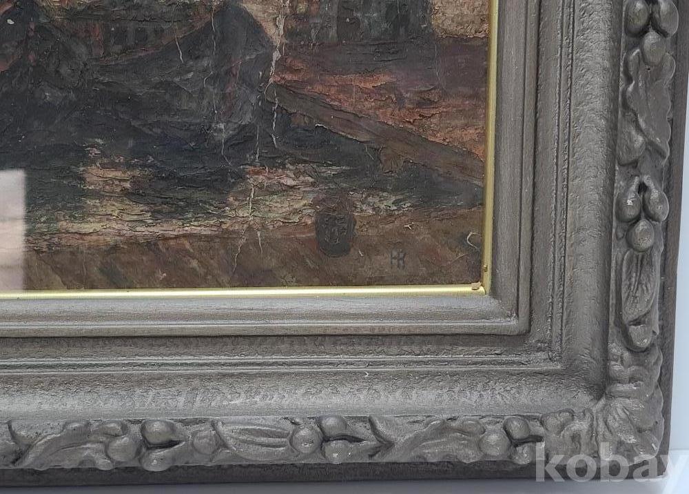 아사천의 보드지에 그린 두터운 유채 작품으로 오래 되어서 그런지 물감의 갈라짐과 균열이 많습니다.