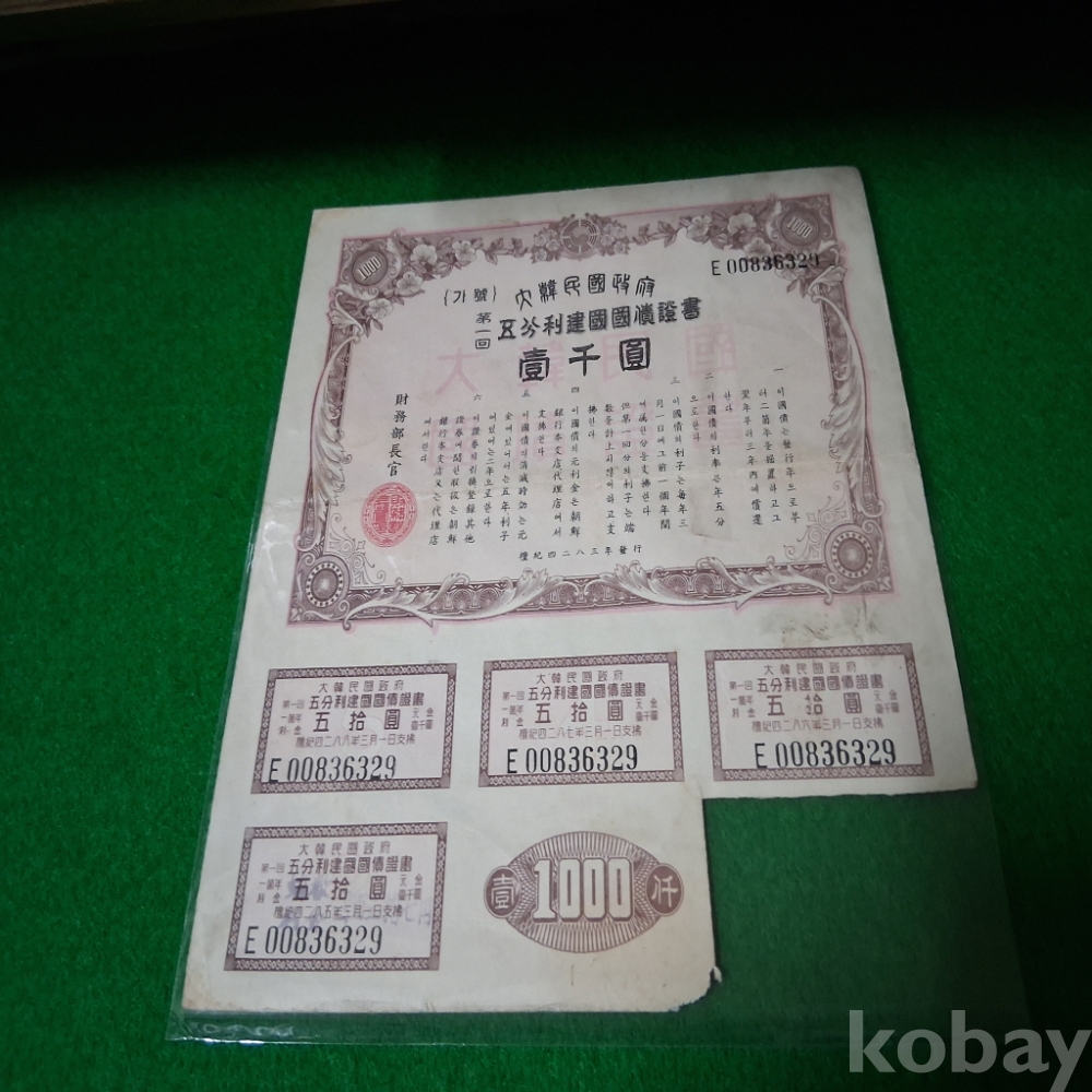 대한민국 5분리건국채권 1회1000원 사용제