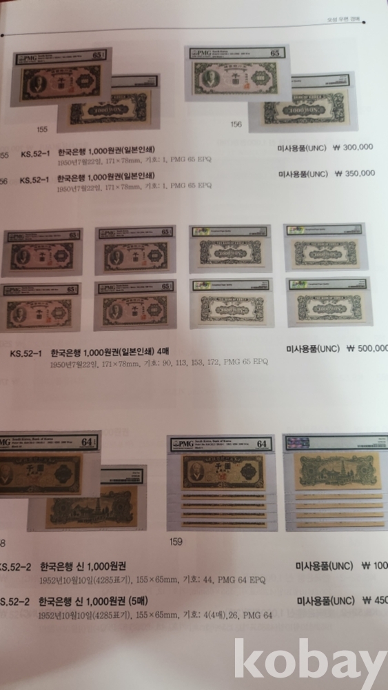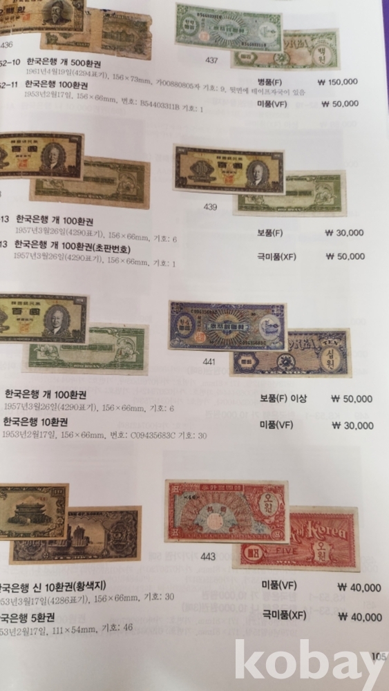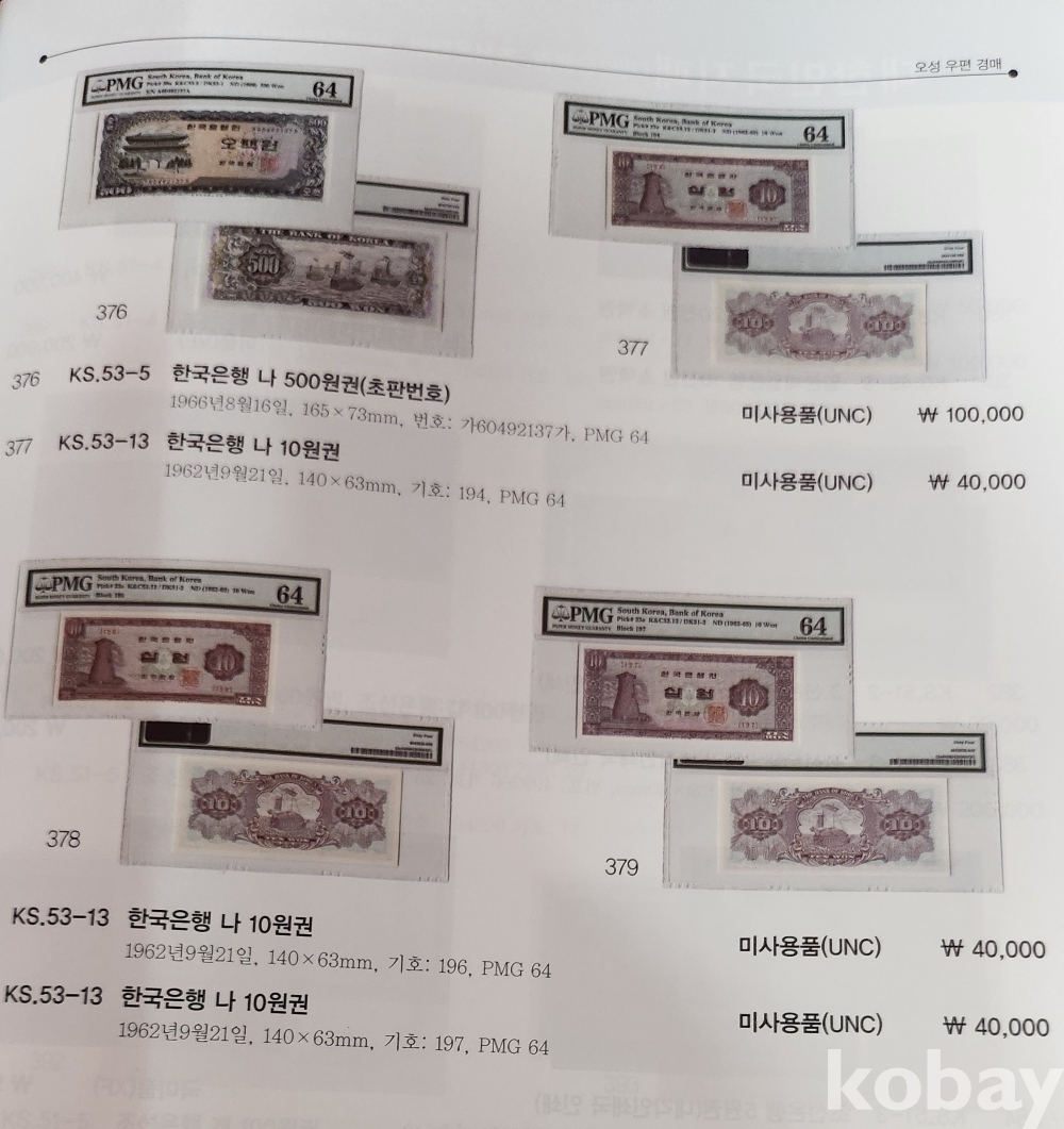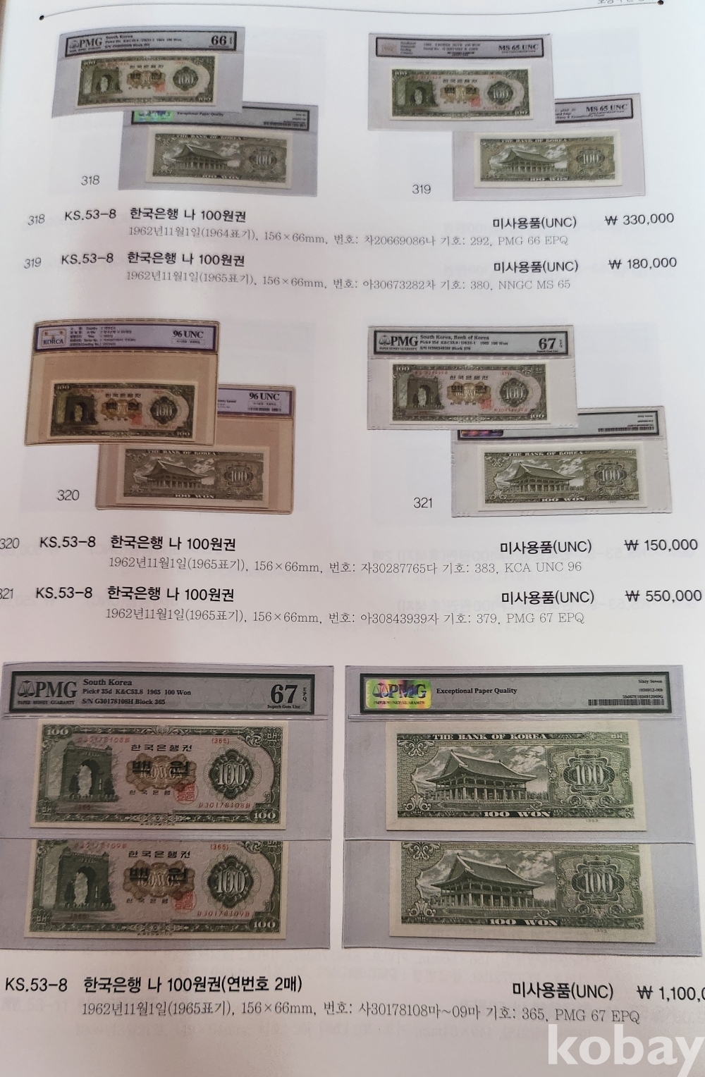 대한민국 통용권 지폐부터 조선은행권까지 다양한 지폐가 경매 낙찰 가격과 함께 수록된 도록입니다,