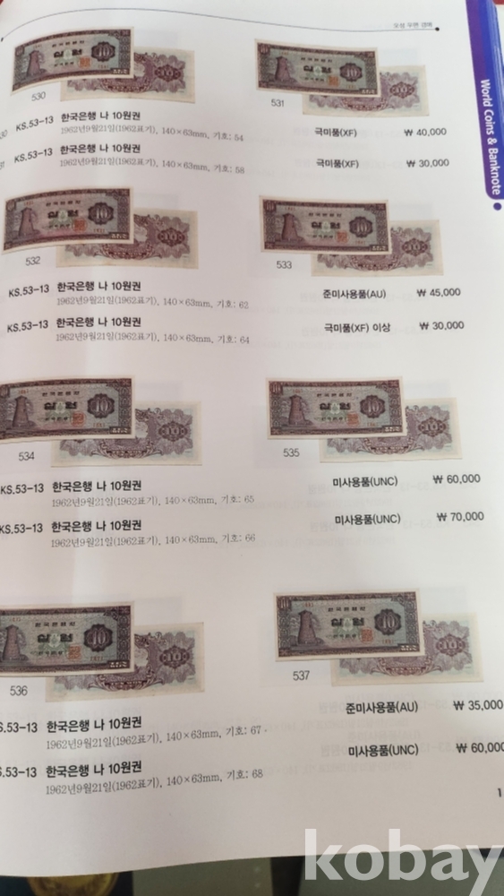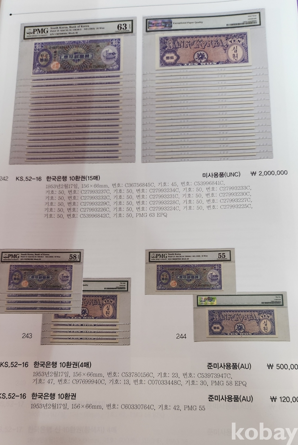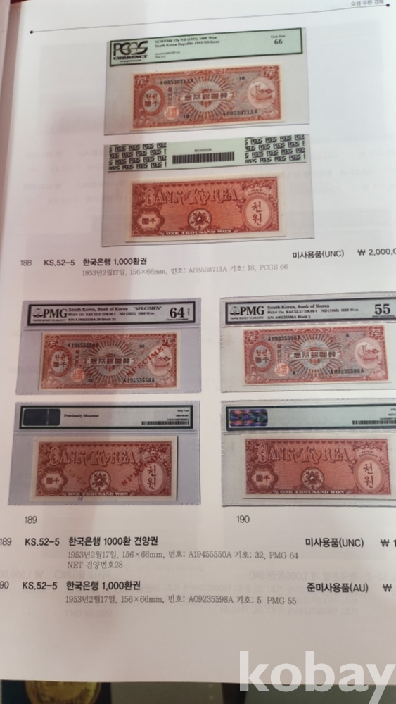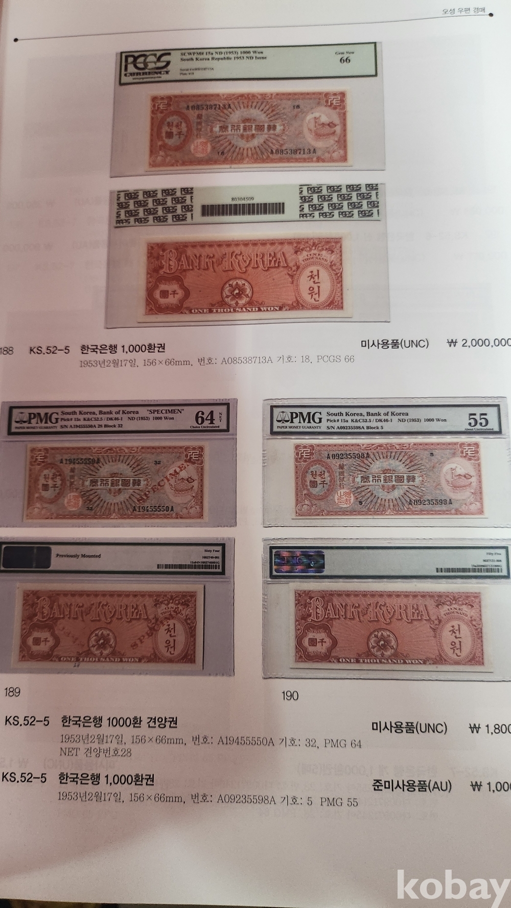 대한민국 통용권 지폐부터 조선은행권까지 다양한 지폐가 경매 낙찰 가격과 함께 수록된 도록입니다,
