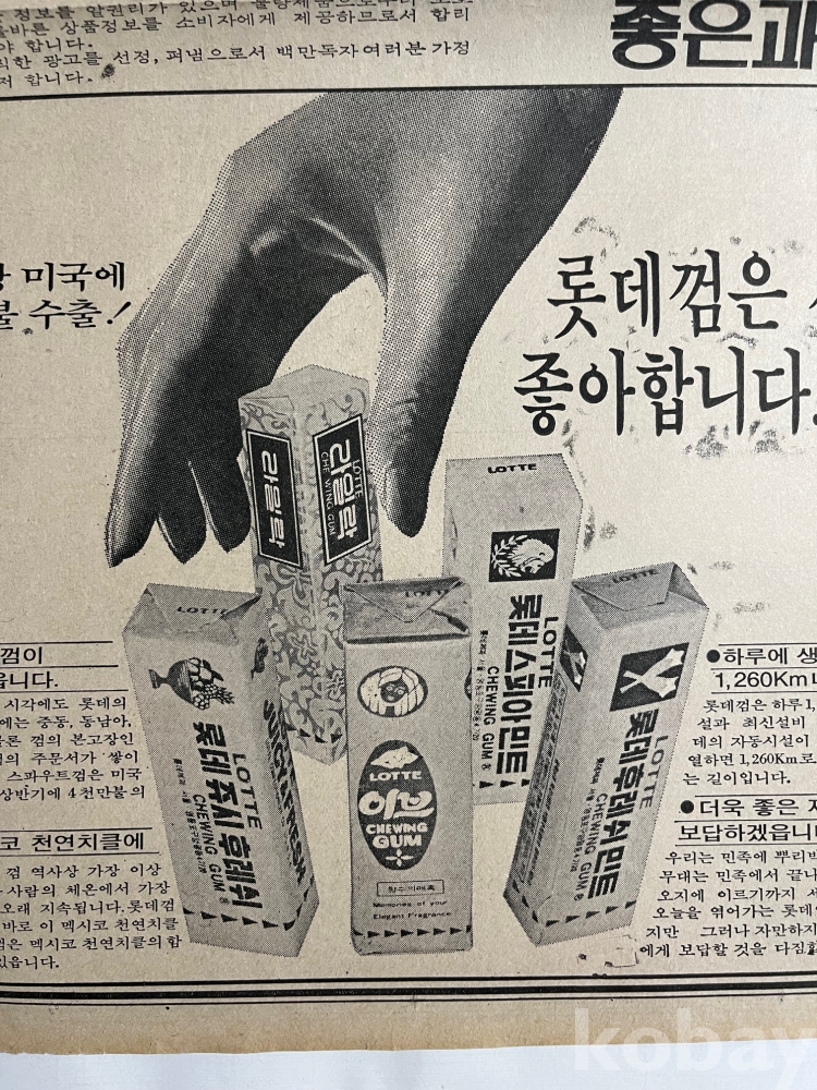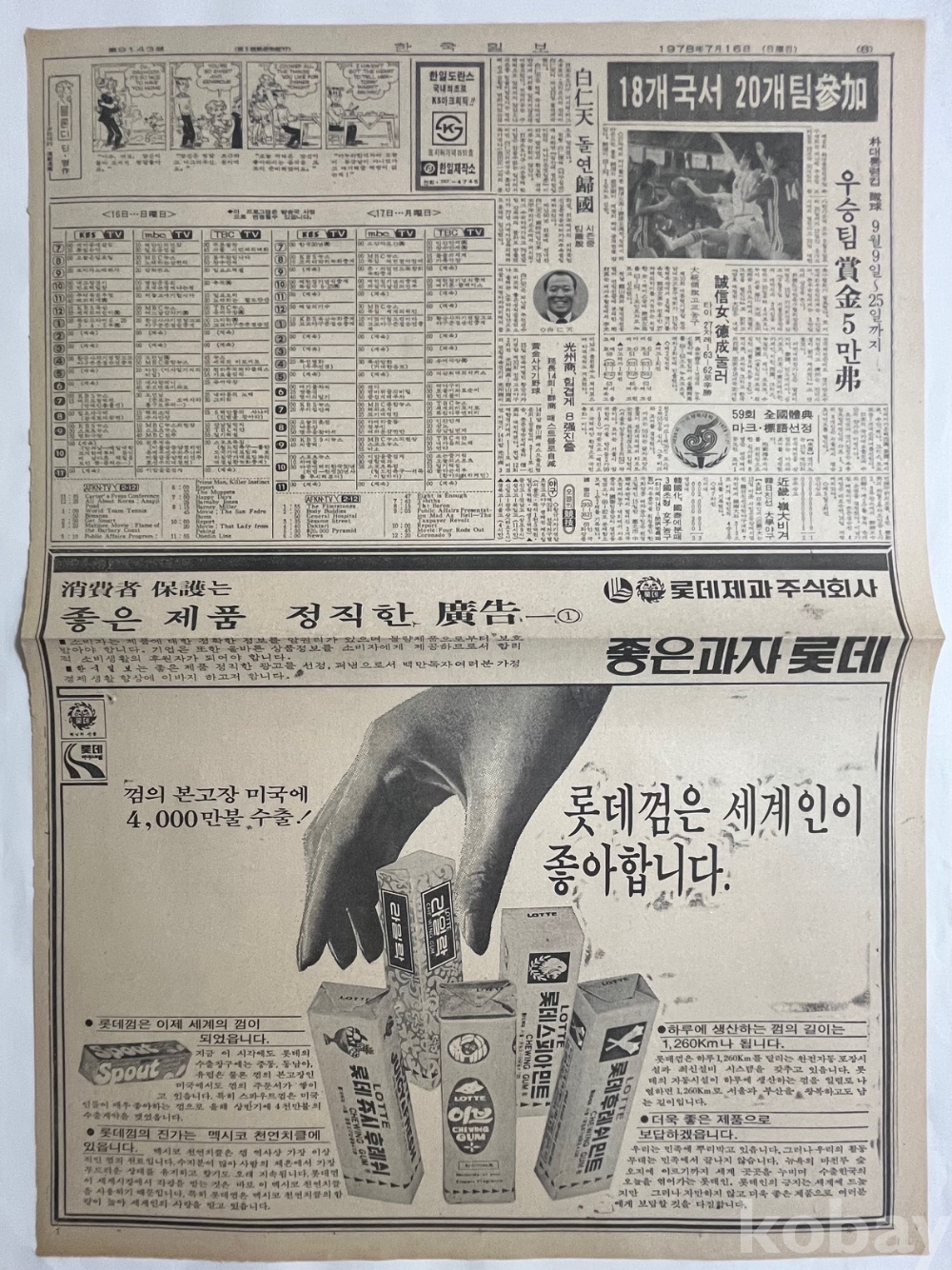 롯데껌 광고가 실린 한국일보 낱장입니다.