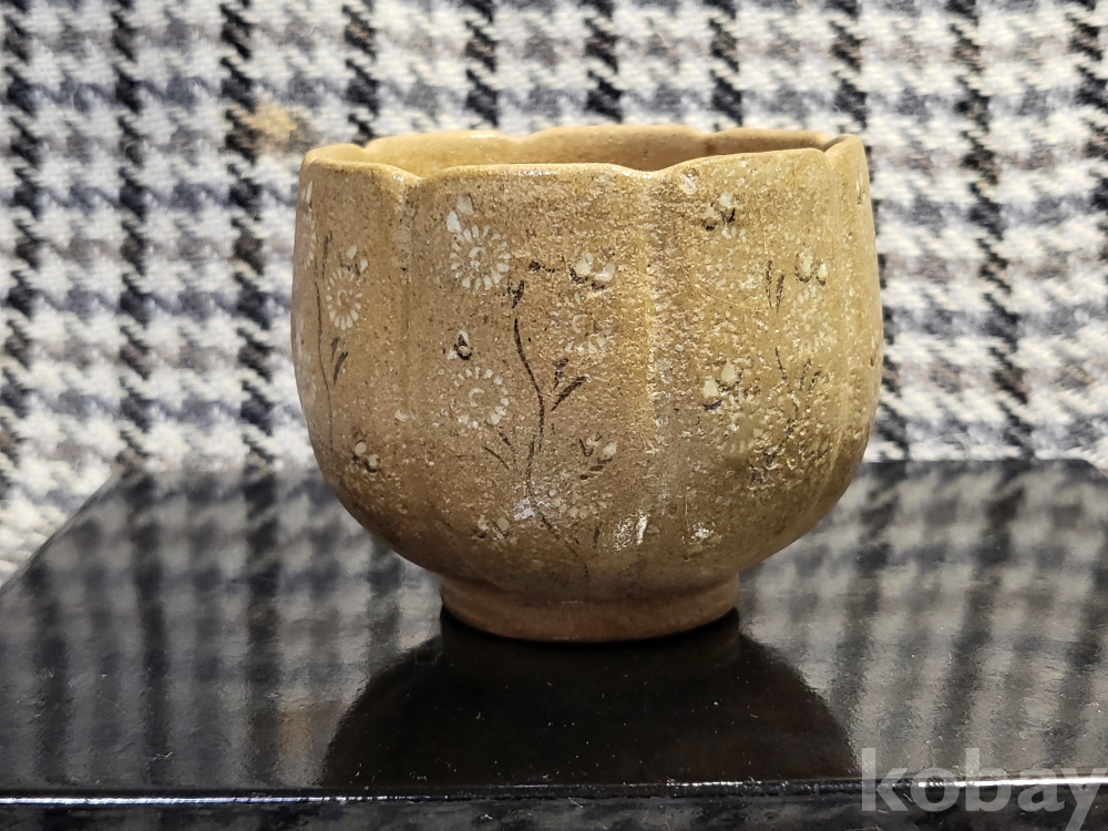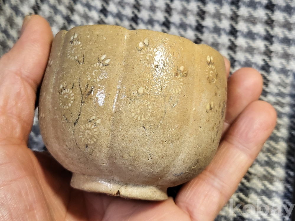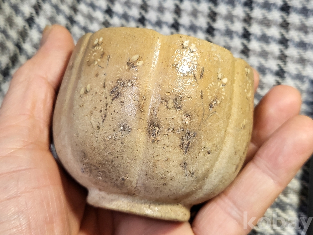 흑백상감기법으로 시문된 정교한 국화문이 일품인 과형 형태의 황청자 탁잔입니다. 각 국화꽃마다 두개씩의 꽃봉오리가 백상감으로 추가묘사된 독특한 도안은 사례를 찾기 힘든 형태입니다.