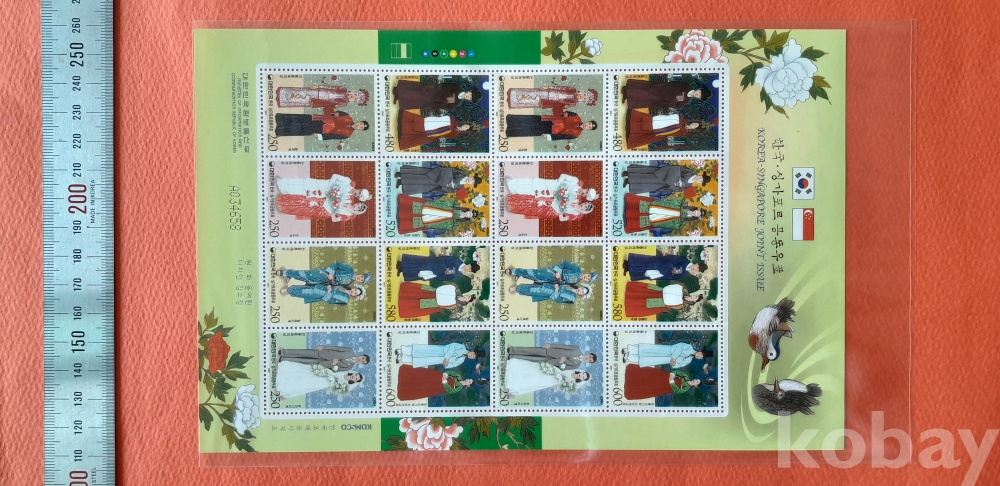 2007 한국 - 싱가포르 공동우표 고액권(480원, 520원) 포함 16매 전지 입니다.