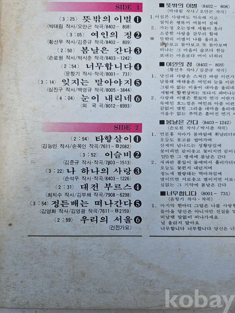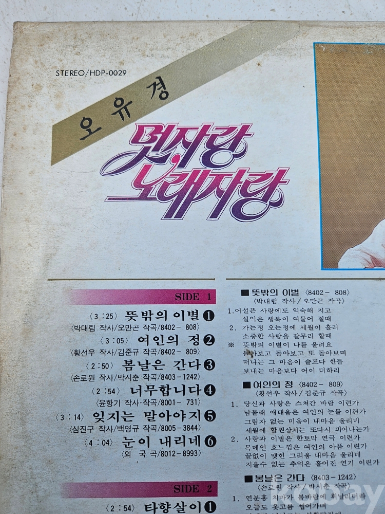 | 자켓상태 | EX : 약간의 마모, 모서리 찢김 존재 | 음반상태 | NM : 개봉했으나 미사용급, 스크래치 없음 | 발매정보 | 초반 | 가사지여부 | 무 |