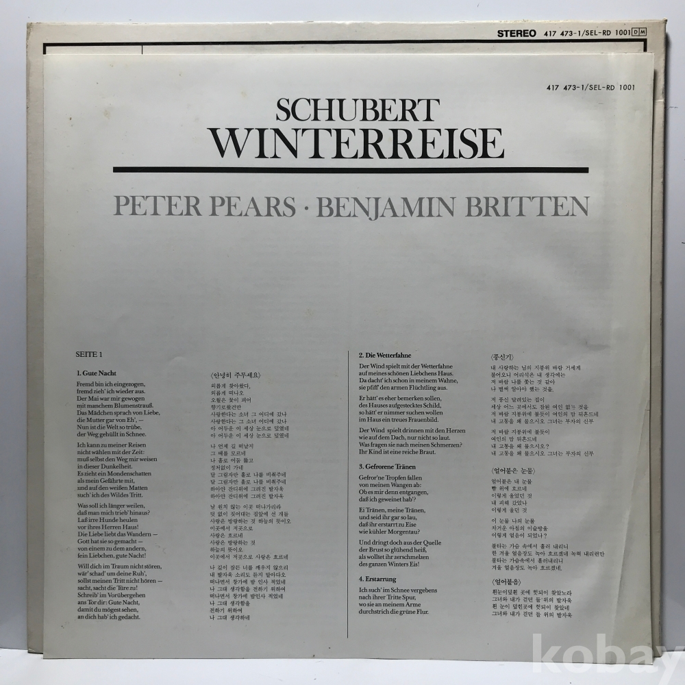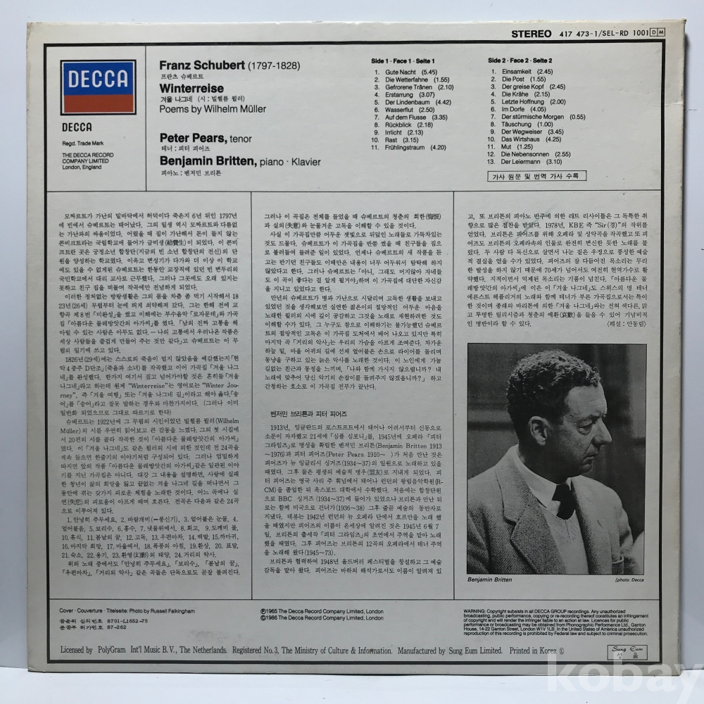 LP 36,150-5 슈베르트 겨울나그네 - 벤저민 브리튼/ 피터 피어즈 . 88 성음 자켓 EX+ 알판 NM