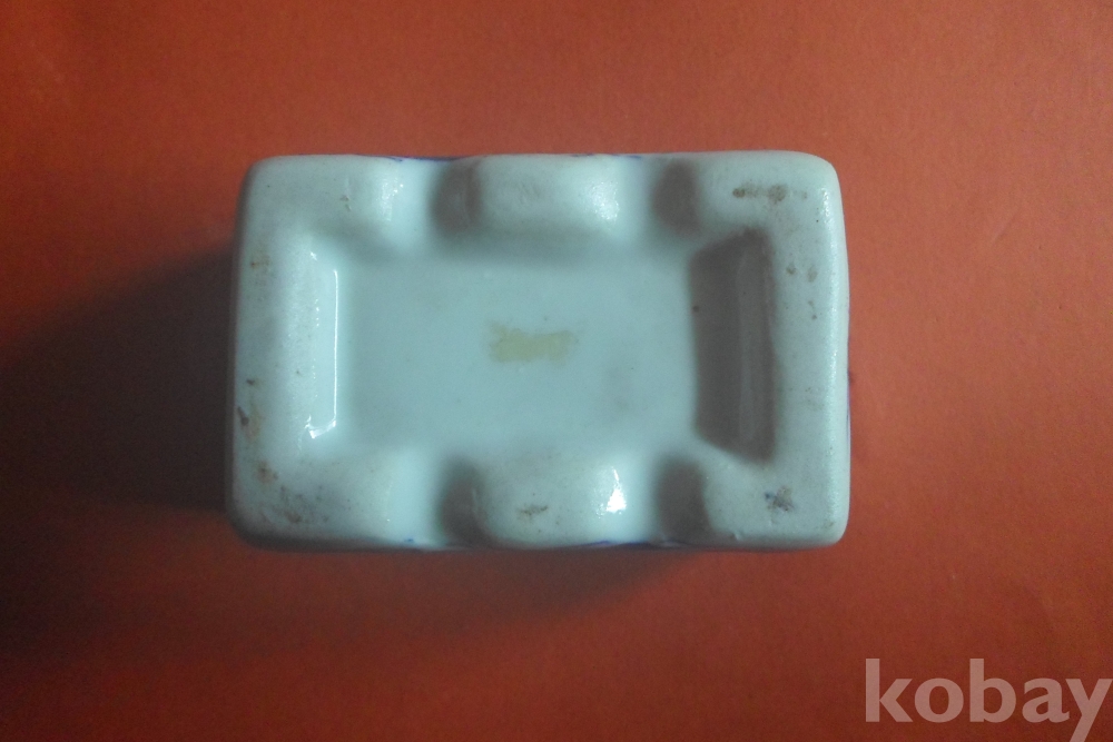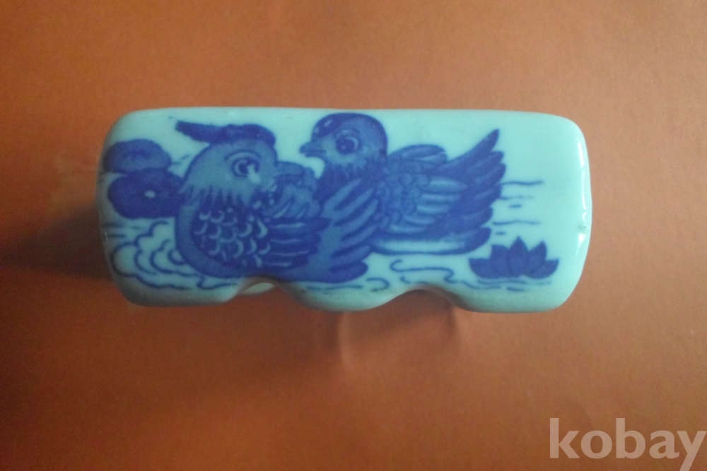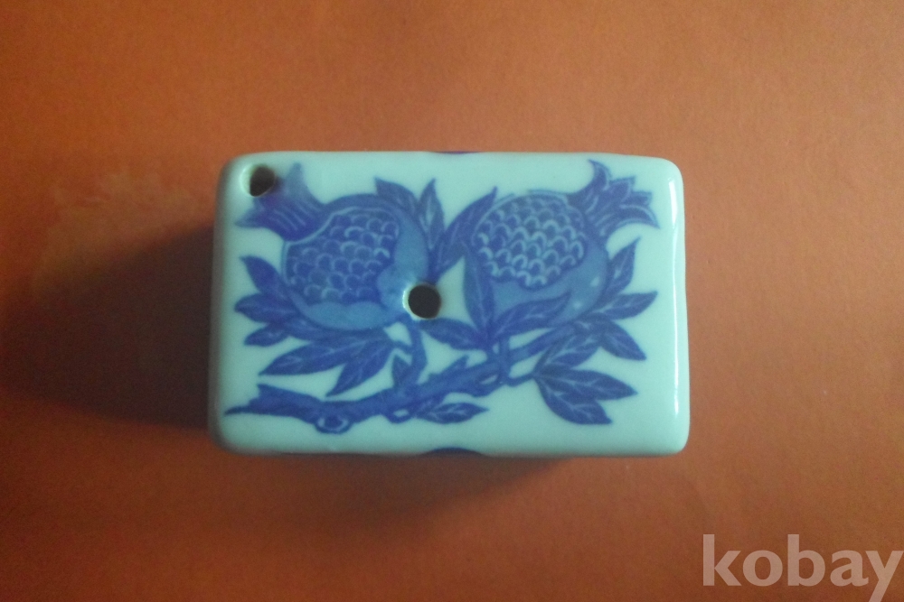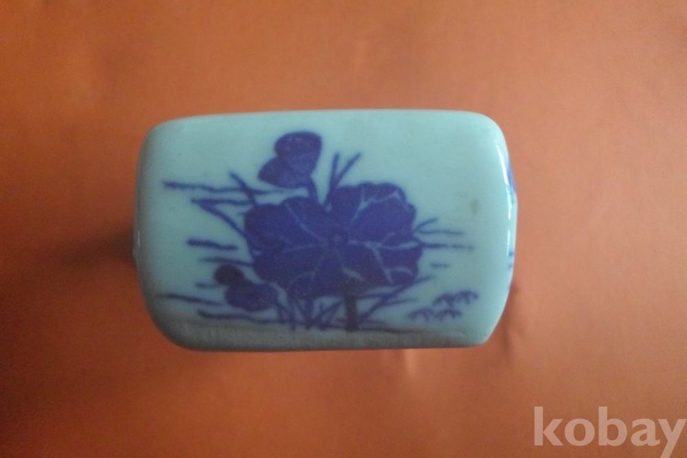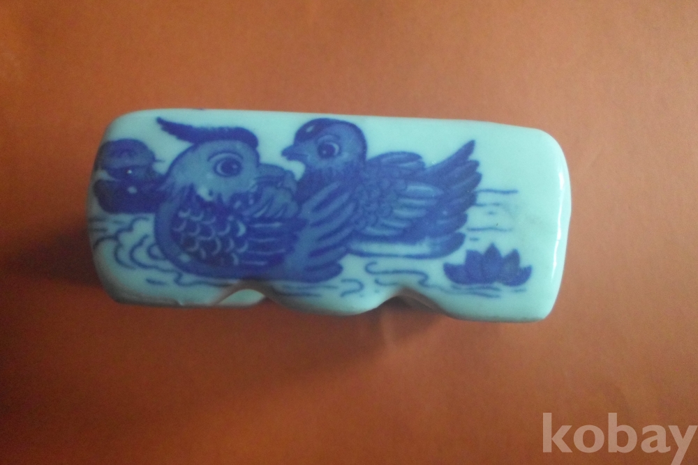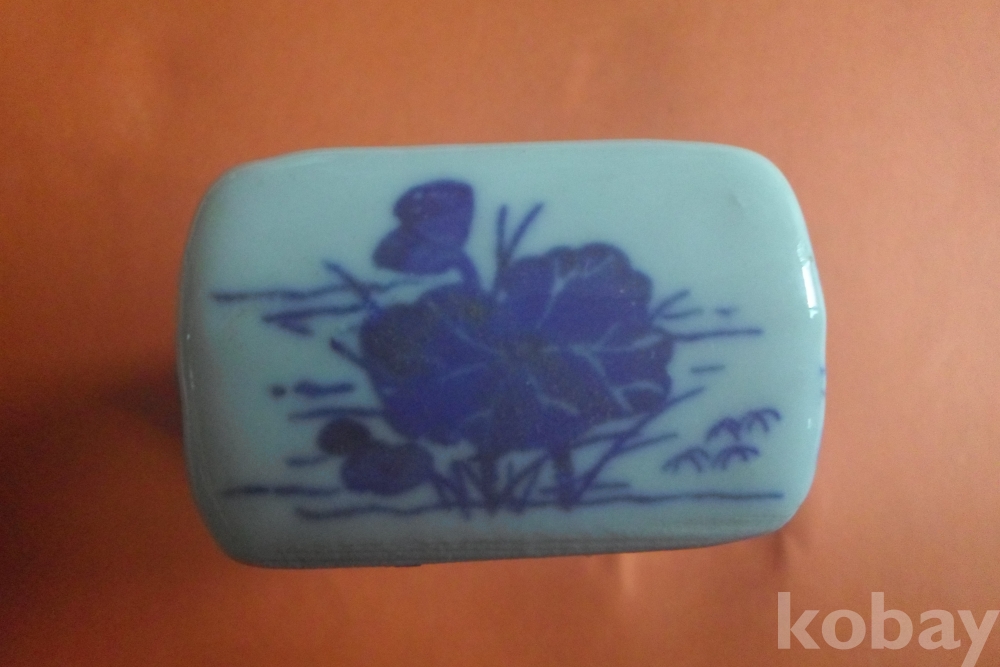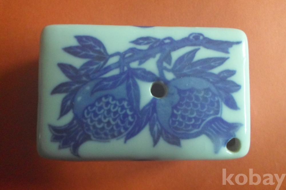 백자에 청화로 석류 두 송이, 양 옆은 원앙 1쌍 양측면에 연꽃이 보이는 연적(옛 선비의 문방필우)