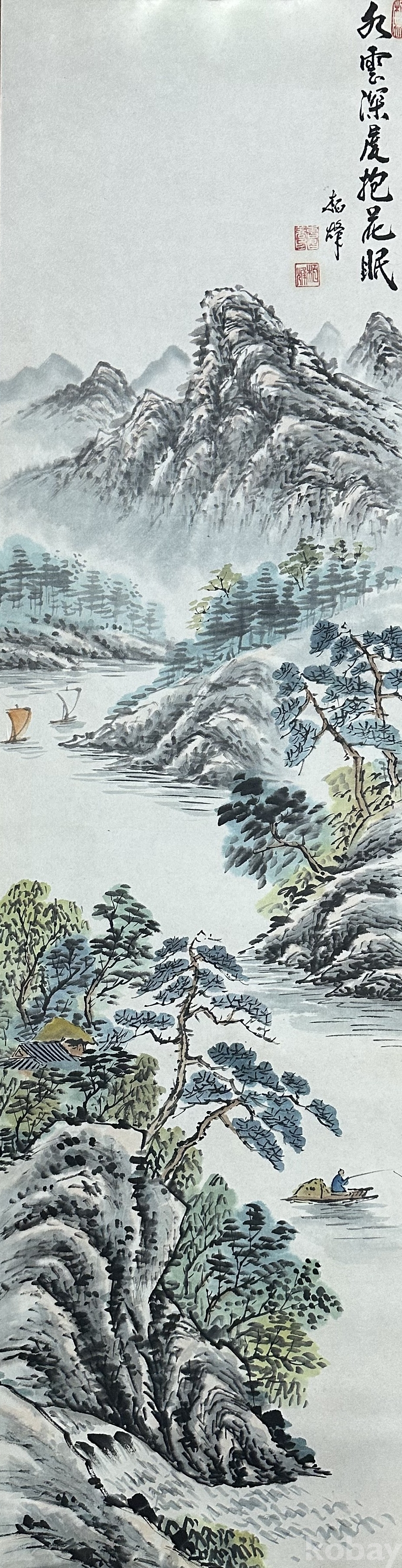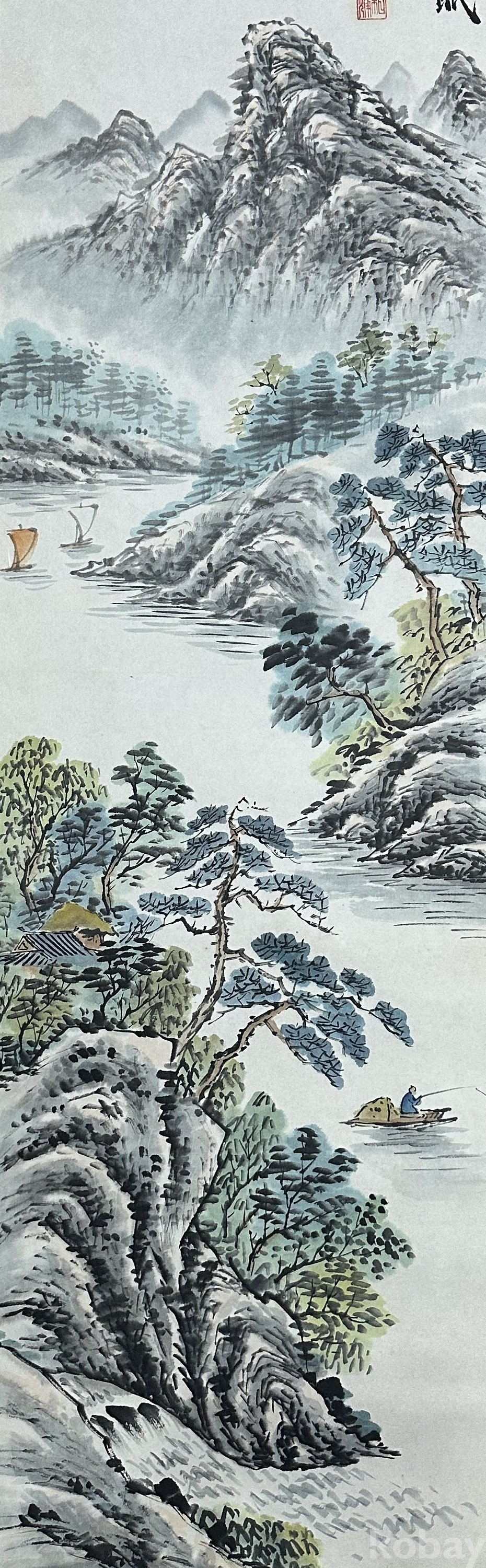 본 작품은 강 위에 배가 떠 있고, 산등성이에는 운무가 감싸 흐르는 고요한 산수의 정경을 담고 있습니다. 잔잔한 수면 위로 낚시를 하는 인물과 멀리 보이는 산세가 균형을 이루며, 담묵과 청록의 번짐이 은은하게 표현되어 있습니다. 화면 상단의 제발과 낙관을 통해 문인화풍의 전통 구도를 따르고 있으며, 붓의 운필이 섬세하고 채색의 농담이 안정된 작품입니다. 전체적으로 수묵화의 여백미와 자연의 고요함이 어우러져 있으며, 감상용으로 적합한 근현대 한국 산수화입니다.