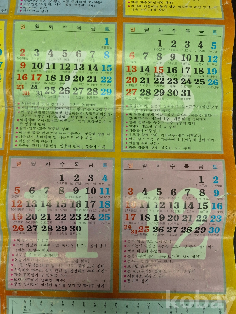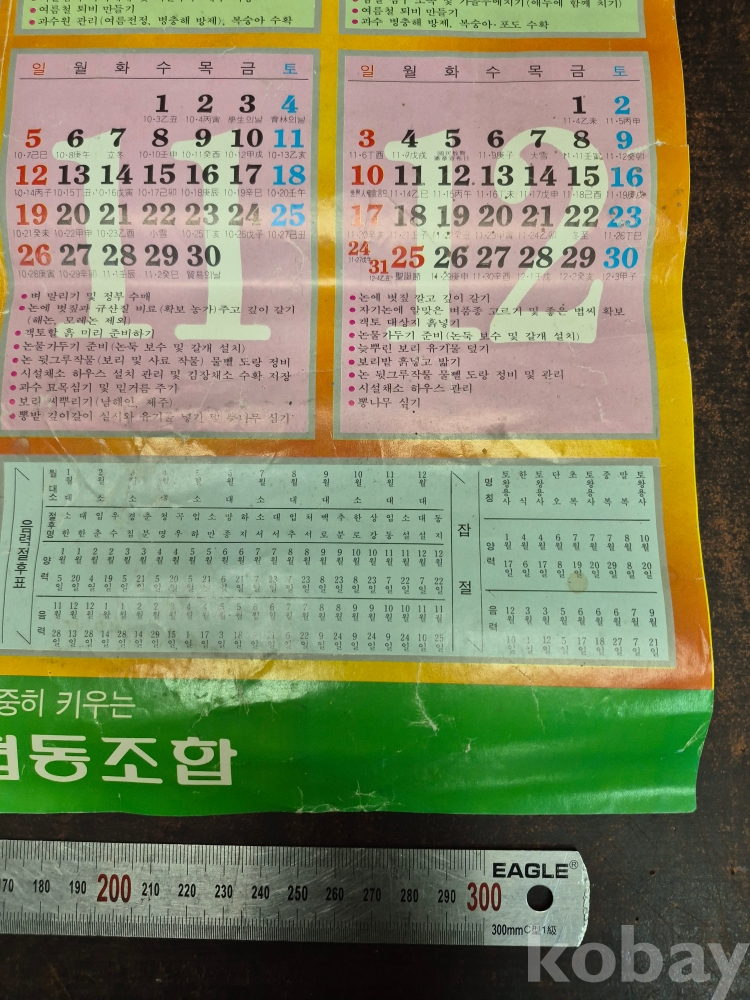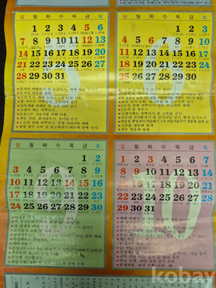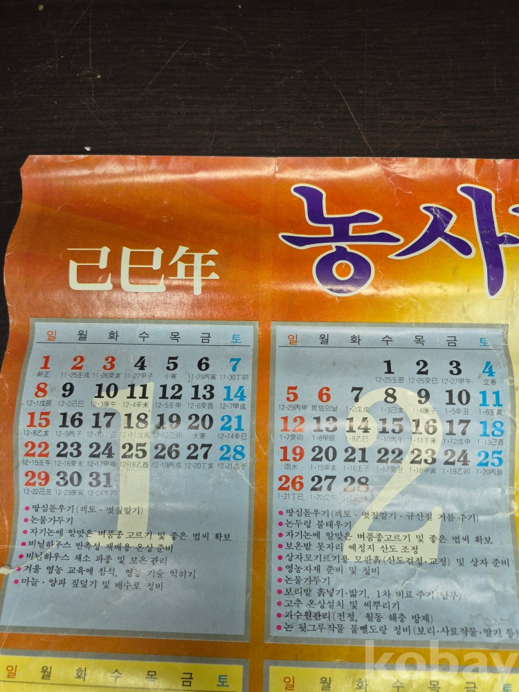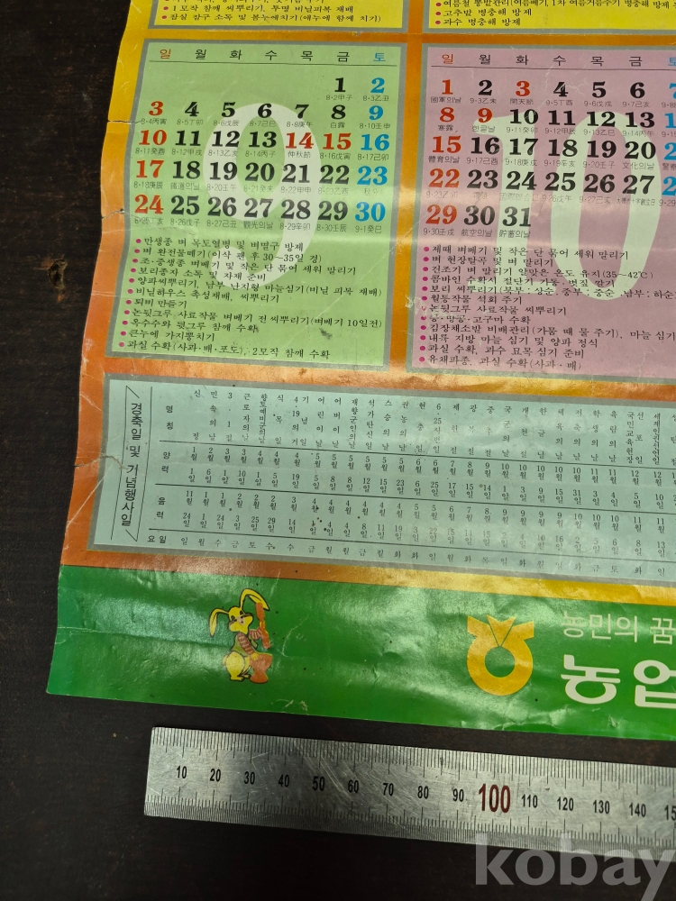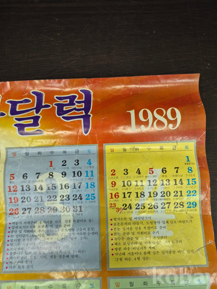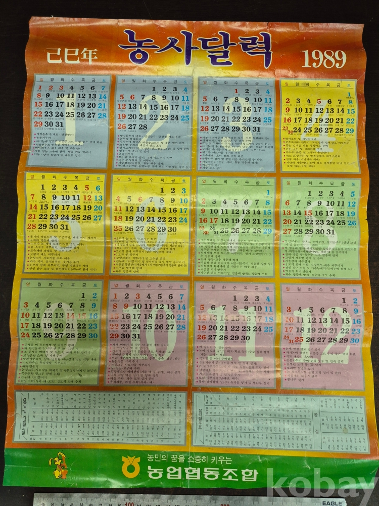 1989년 기미년 1년 농사 달력 농업협동 조합 5센티 정도 찢어짐 있어서 테이프 마감 되어 있어요 39*52