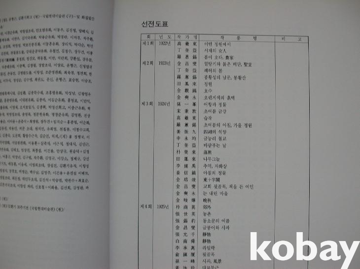 우선 <양화 백년 연표>가 있다. 연표와 그룹전, 국제전, 개인전들이 1984년까지 수록되었고 그룹연표는 1988년까지 수록되었다. 이어서 <선전도표>를 실어 연도별로 작가와 작품명을 확인할 수 있게 하였고 <선전도판>도 한 쪽에 8~10작품씩 1940년의 19회까지 흑백으로 수록되어 있다. 다음은 <국전출품상황>과 <국전도표>가 1949년 1회부터 1981년의 30회까지 수록되었다. 끝에는 1963년부터 1987년까지의 <설치미술연표>가 있다.