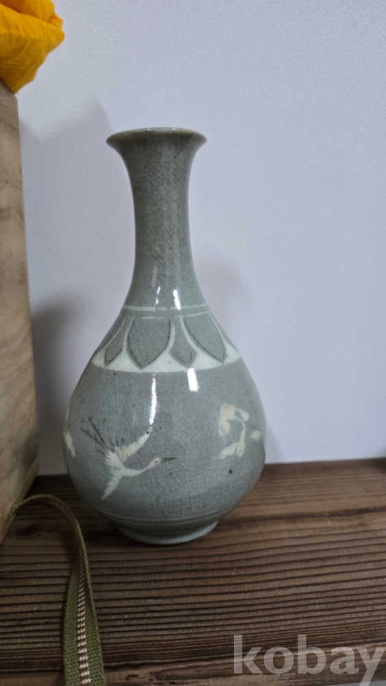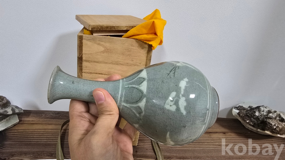 맑고 깊은 비색 유약 아래로, 흑백 상감 기법으로 정교하게 새겨진 학과 구름(운학문)이 마치 하늘을 유영하듯 생동감 있게 펼쳐집니다.