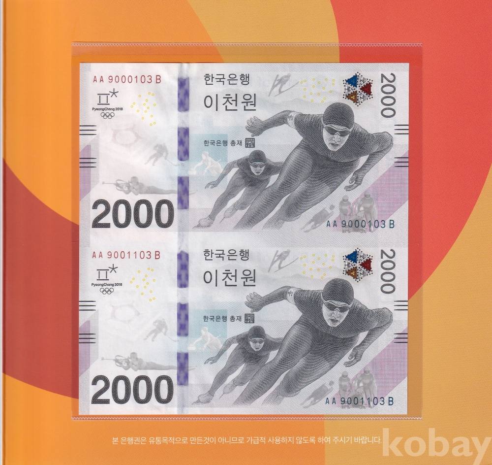 - 2018년 평창 올림픽기념 2,000원 초판 AAB 9000103 / AAB 9001103 - 2연결권 미사용 지폐 입니다.