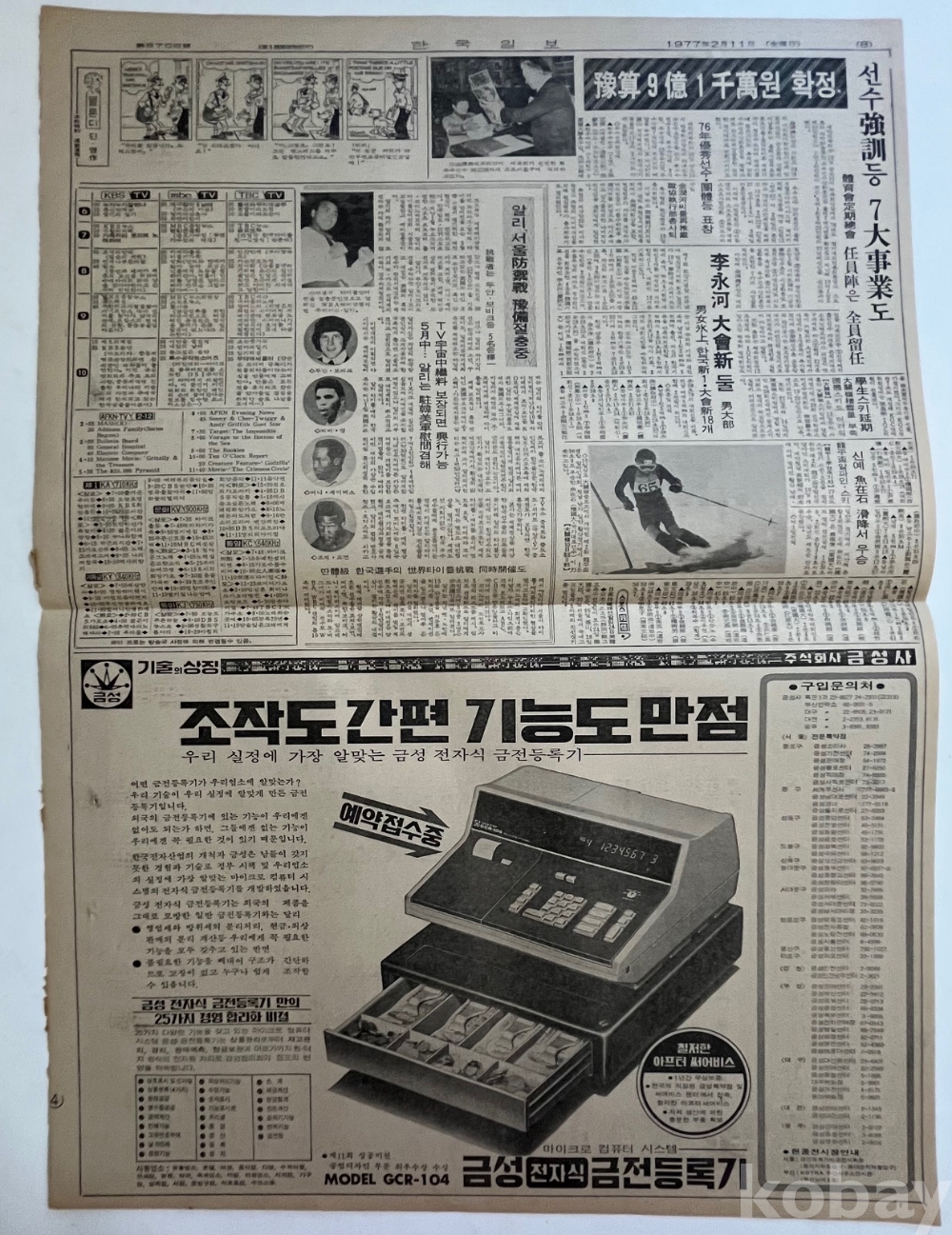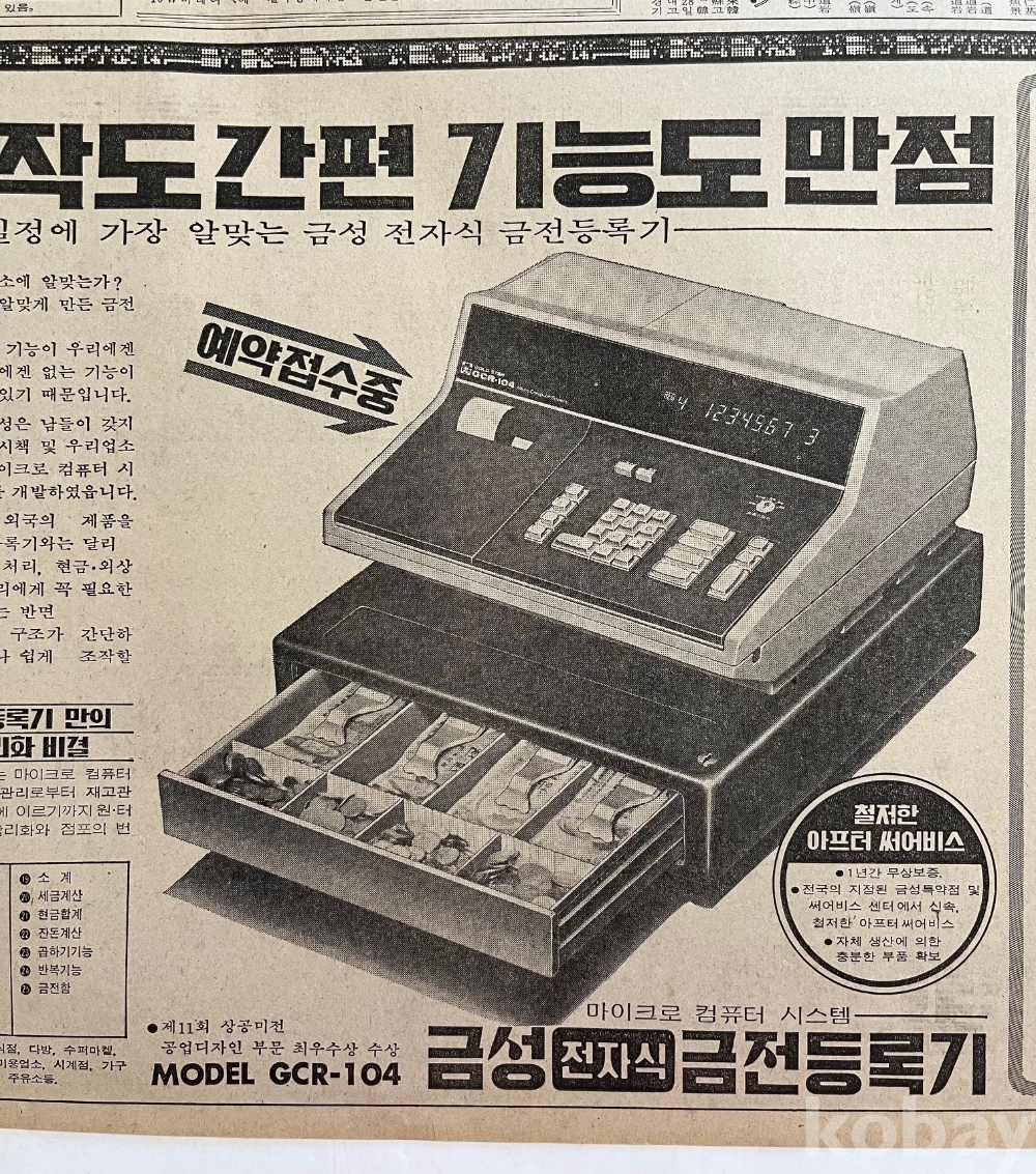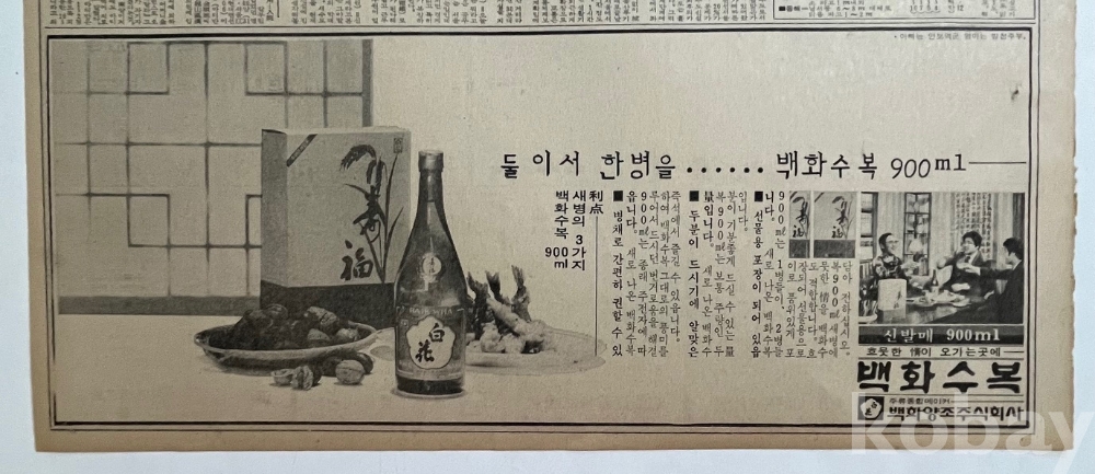 백화수복 광고와 뒷면 금성금전출납기 광고가 실린 1977년 한국일보 낱장입니다.