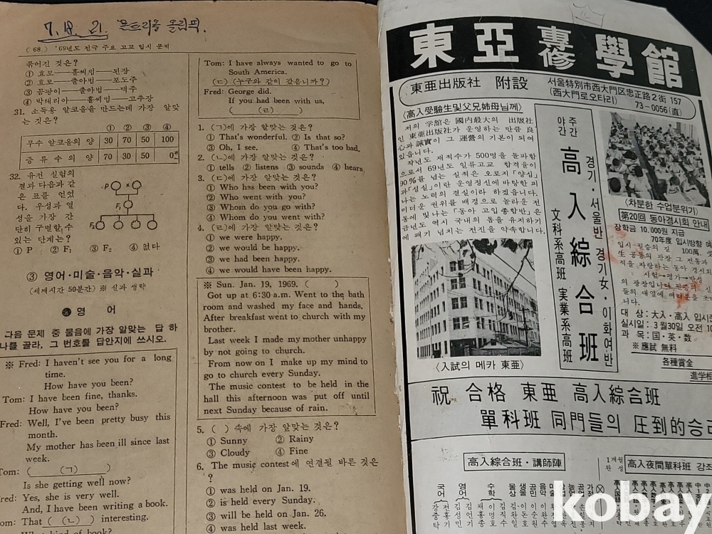빈티지 세월 감이 느껴지는 1969년 발행 고입수험지 합격생 창간호입니다.