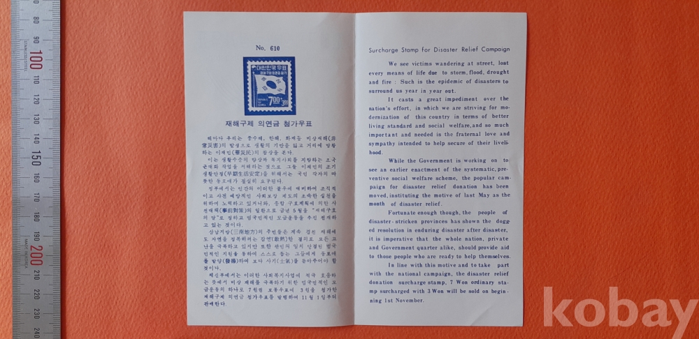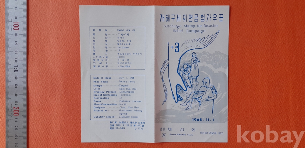 1968년 11월 1일 발행 재해구제의연금 참가 우표 안내카드 입니다.