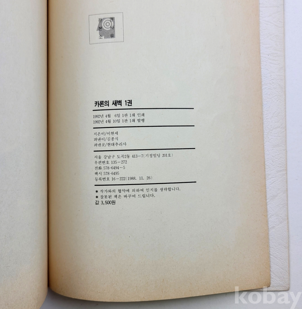 물 품 명 | 이현세 / 카론의 새벽 (1~3)완결 총3권 / 1992년 초판 / 현대추리사 |