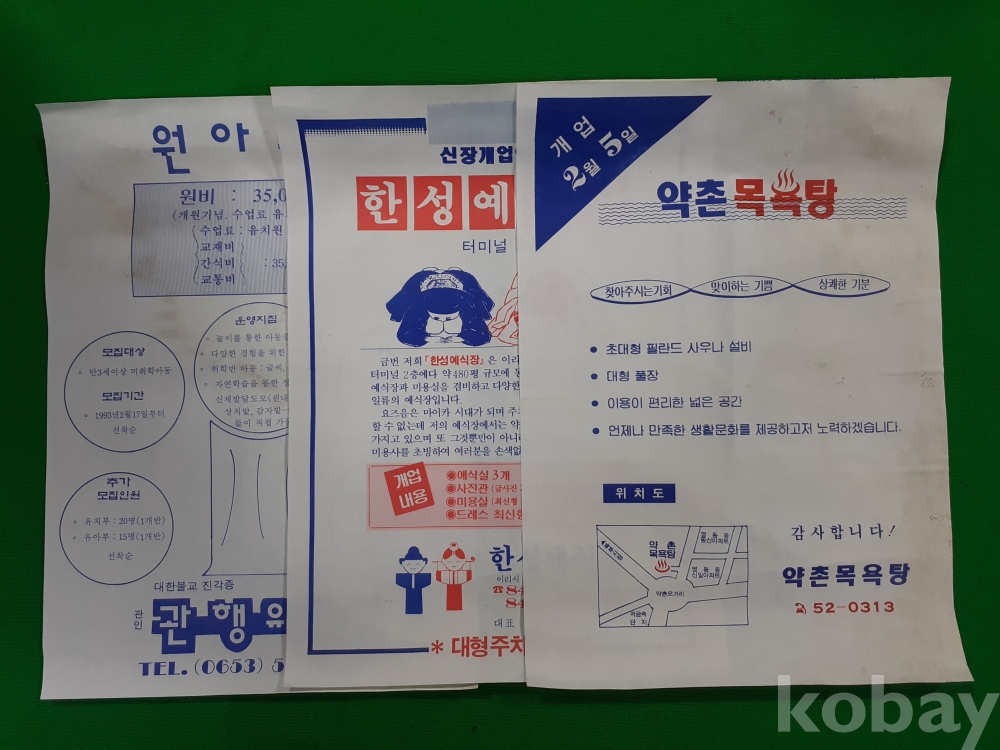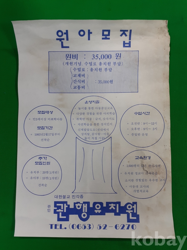 세월의 흔적 있으나 상태 양호 하며, 관행 유치원 광고지 우측 상단 미세한 찢김 있습니다