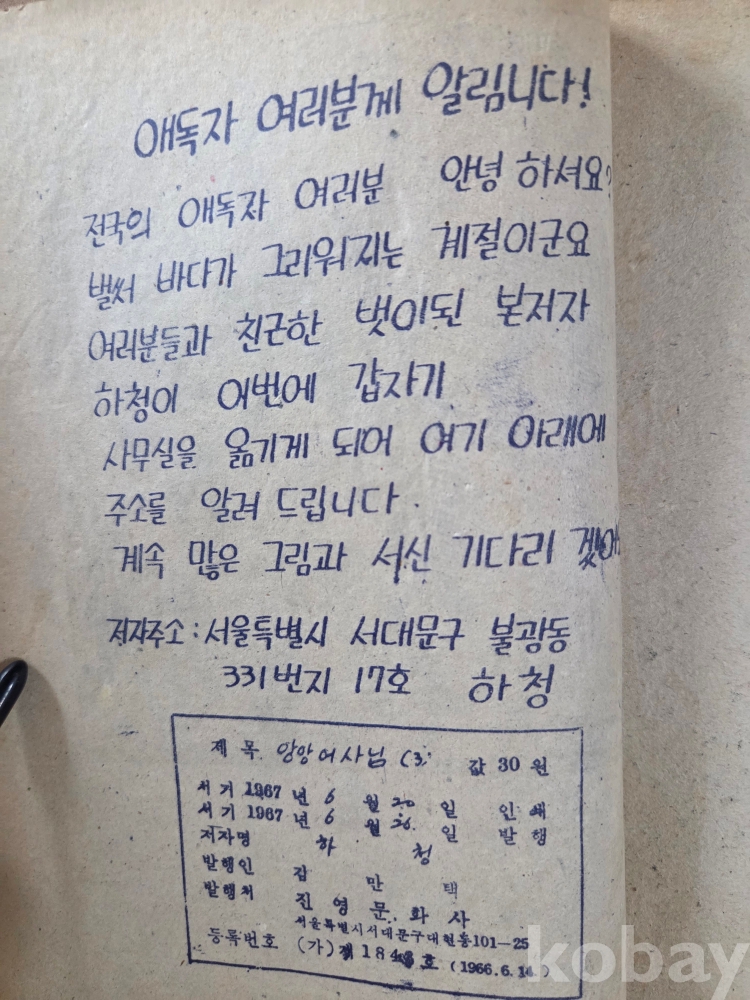 하청 <앙앙 어사님> 제3권. 1967년 6월 26일 판입니다.