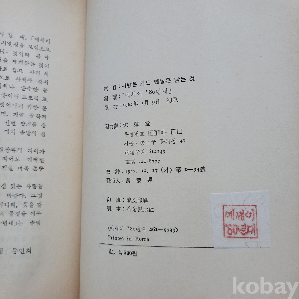 [희귀본] 사랑은 가도 옛날은 남는것 (에세이‘80년대/ 대운당 82년 초판) : 세월흔적, 중급/서고I08