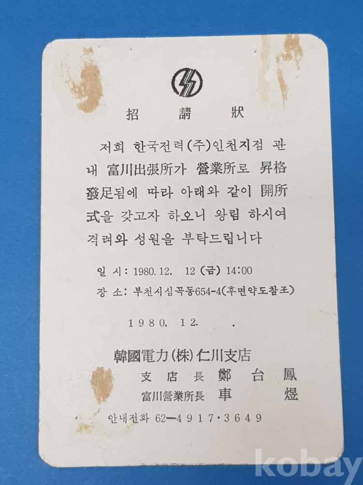 **** 1980년 한국전력(주)인천지점 부천영업소 승격 개소식 초청장