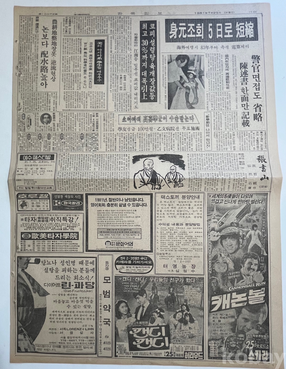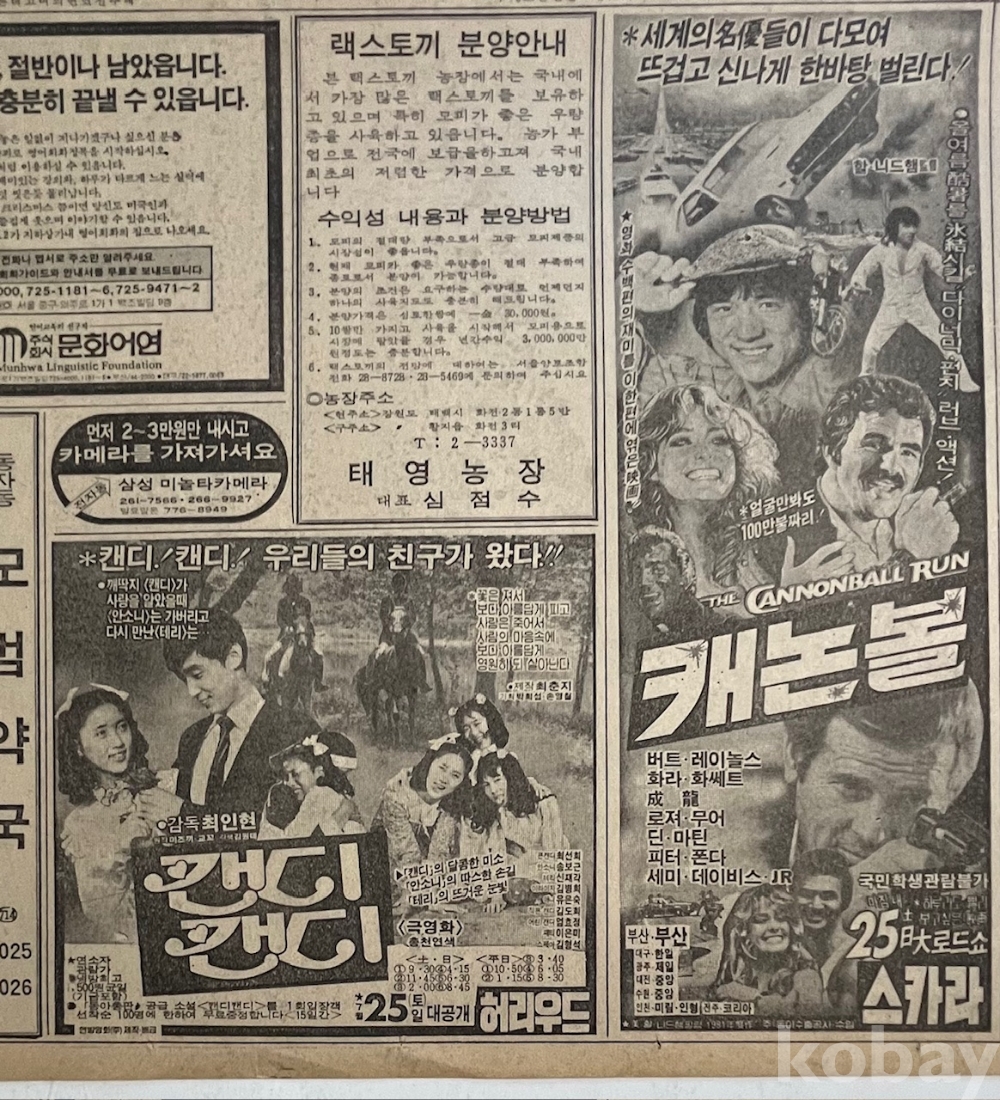 영화 캔디캔디, 캐논볼 광고가 실린 1981년 한국일보 낱장입니다.