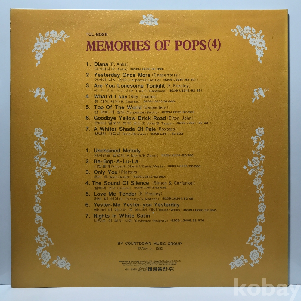 LP 82,350-37 MEMORIES OF POPS(4) ORIGINAL ARTISTS . 자켓 EX+ 알판 EX+ 82 년제작 국내반