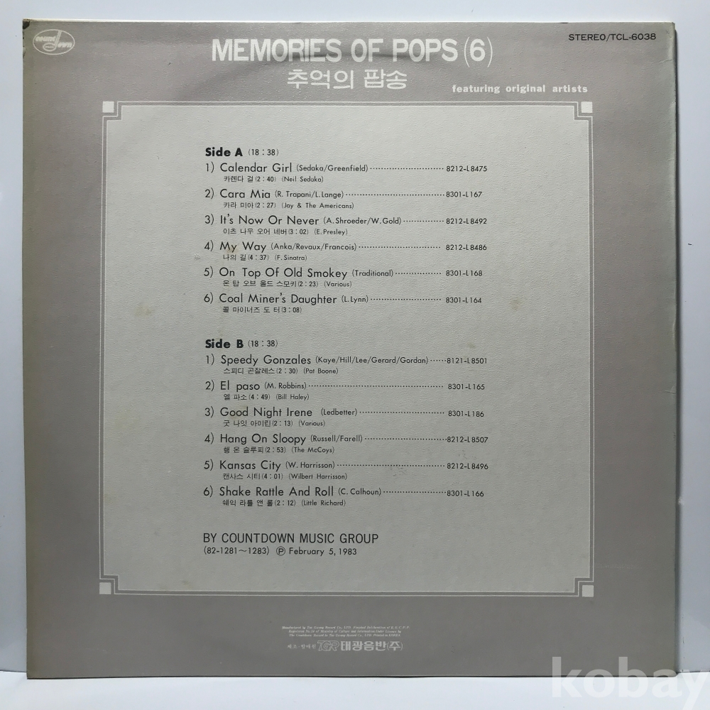 LP 82,350-39 MEMORIES OF POPS(6) ORIGINAL ARTISTS . 자켓 EX+ 알판 작은휨 일부 불량 82 년제작 국내반