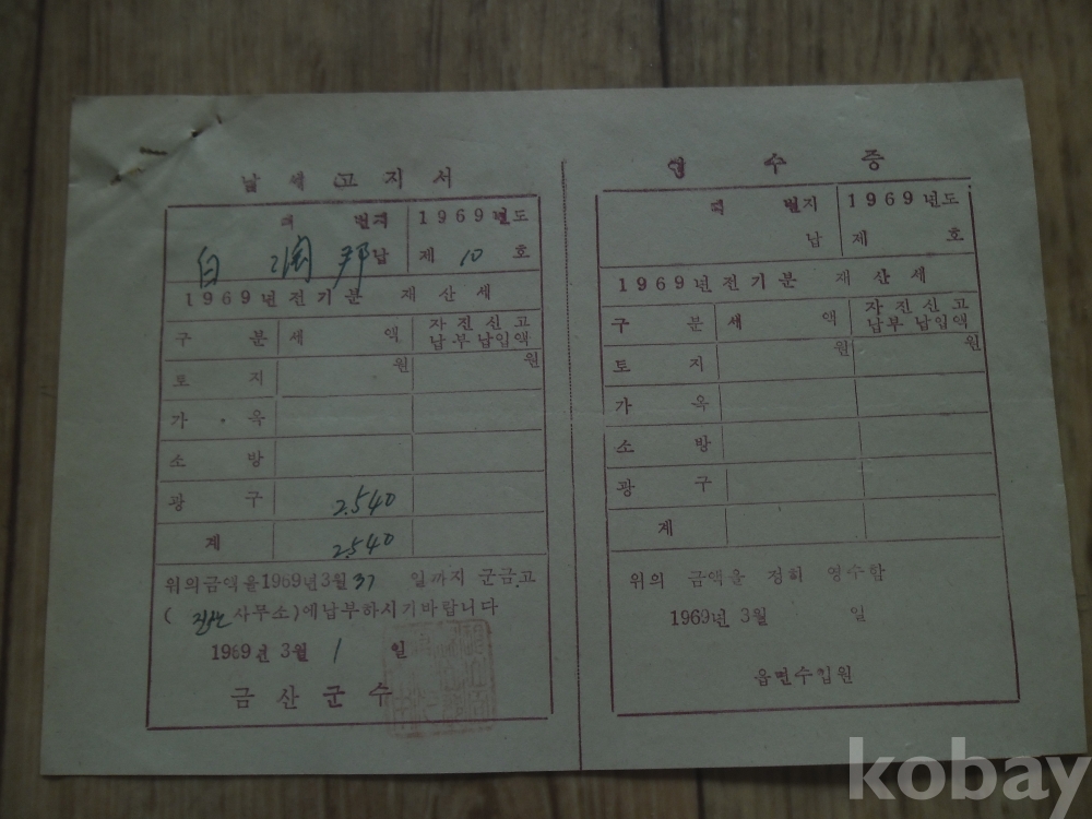 옛 영수증(계산서): 1969년 재산세 납세고지서.영수증(금산군)