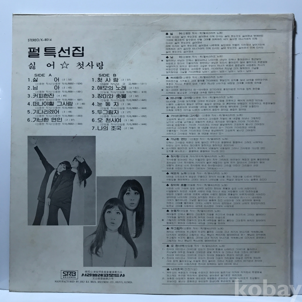 LP 36,350-46 펄씨스터즈 펄특선집 - 싫어/ 첫사랑 신중현 작사작곡 . 80 서라벌 자켓 EX+ 알판 EX+