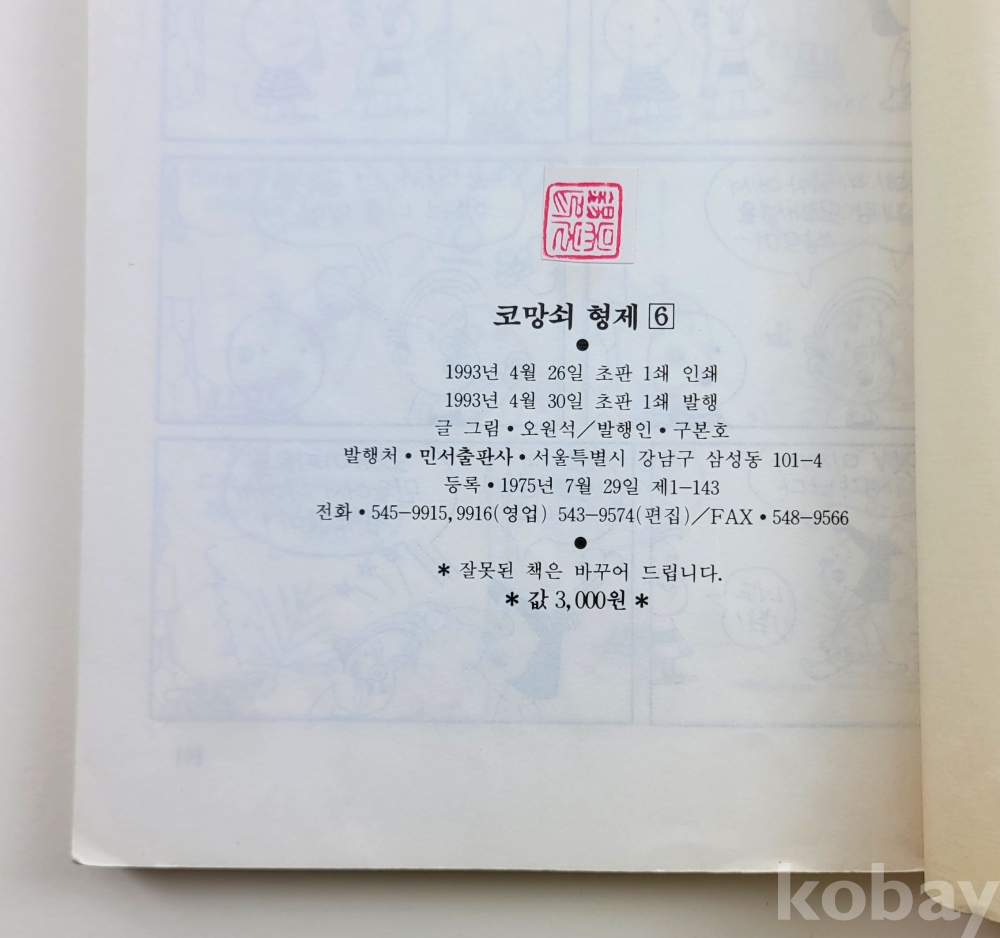 물 품 명 | [명량만화] 오원석 / 코망쇠 형제(6) / 소년동아일보 인기연재만화 / 1993년 초판 / 민서출판사 |
