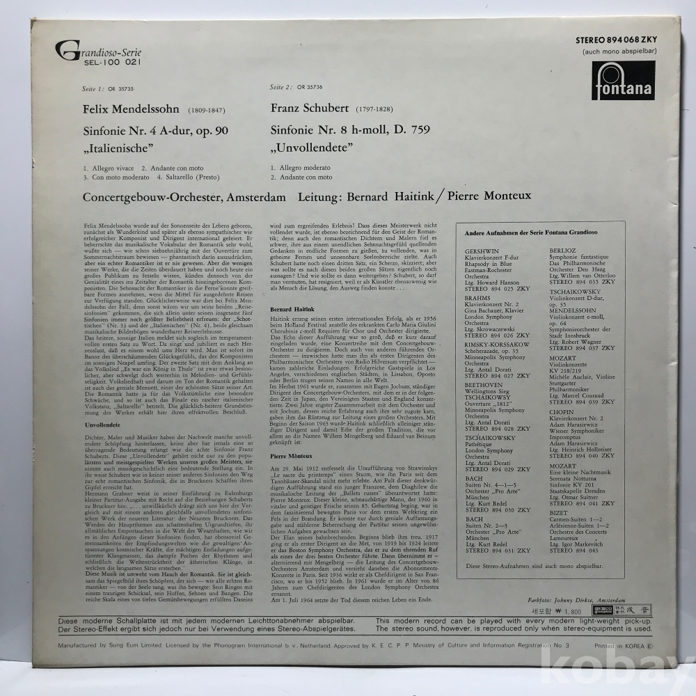 LP 36,050-66 Mendelssohn Schubert Sinfonie Nr.4 Nr.6 . 72 성음 자켓 EX+ 알판 EX+