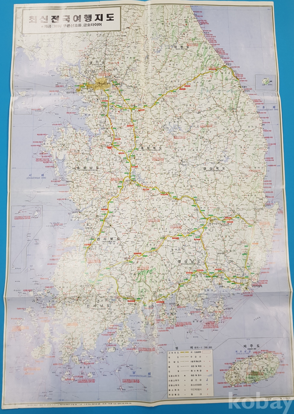 **** 최신전국여행지도/축척 1;700,000 주요 도로,철도,도시,주요산,해수욕장,골프장,등대 등이 실림/항로,도시간 거리가 표기되어 있다/금호타이어 홍보용 팜플릿