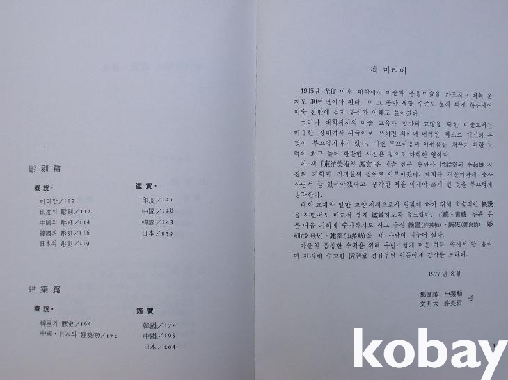 표지에 각각 담당분야로 회화/도자/조각/건축를 밝혔다. 머리말에 미흡한 미술도서 사정에 "학술적인 개설을 쓰면서도 비교적 쉽게 감상하도록" 썼다고 하였다.