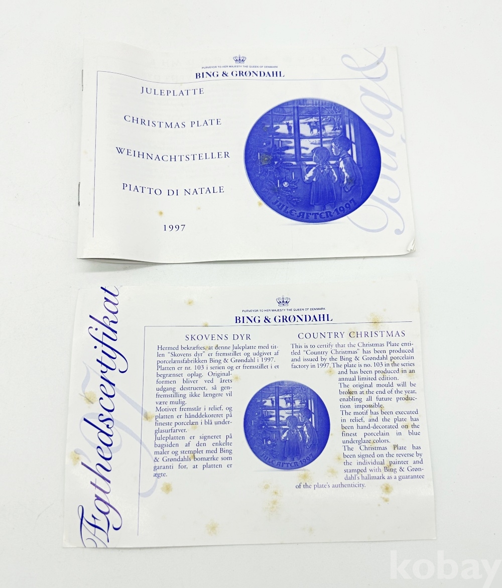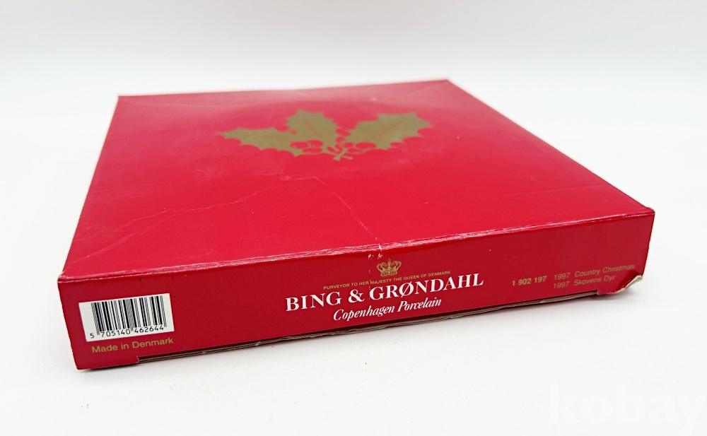 상품설명 | 덴마크 코펜하겐의 빙앤그뢴달에서 제작한 1997년 크리스마스 기념 접시로, 시리즈 중 103번째 접시이다. 하단에 적힌 'Jule aften'은 크리스마스 이브를 뜻하는 덴마크어이다. 박스 18.5 x 18.5 cm, 접시 18 x 18 cm / 설명서 2부 | ||