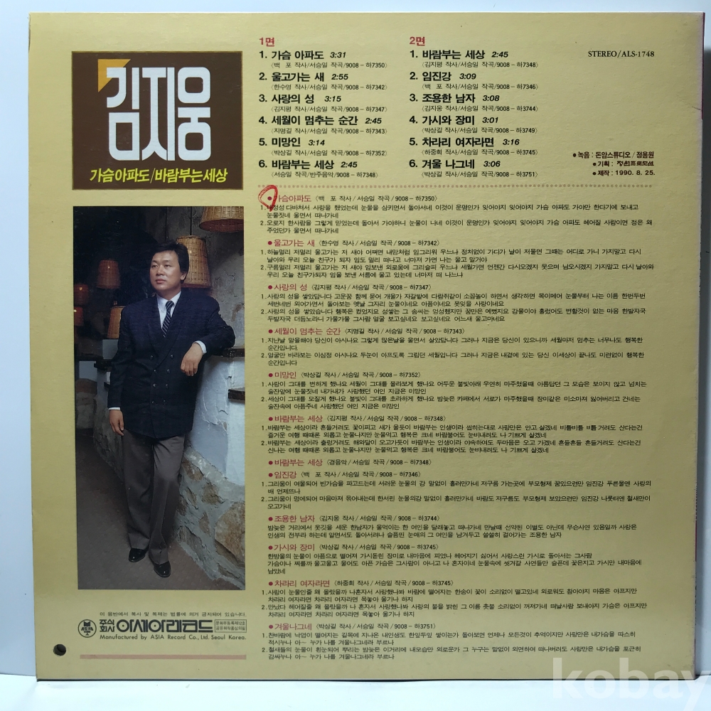 LP 83,770-25 김지웅 - 가슴아파도/ 바람부는 세상 . 자켓 EX+ 알판 NM 90 년제작 국내반