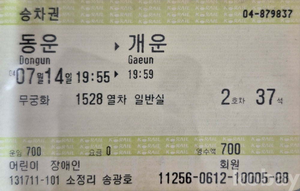 2004. 6. 12. 소정리역 발매 동운-개운 승차권입니다.
