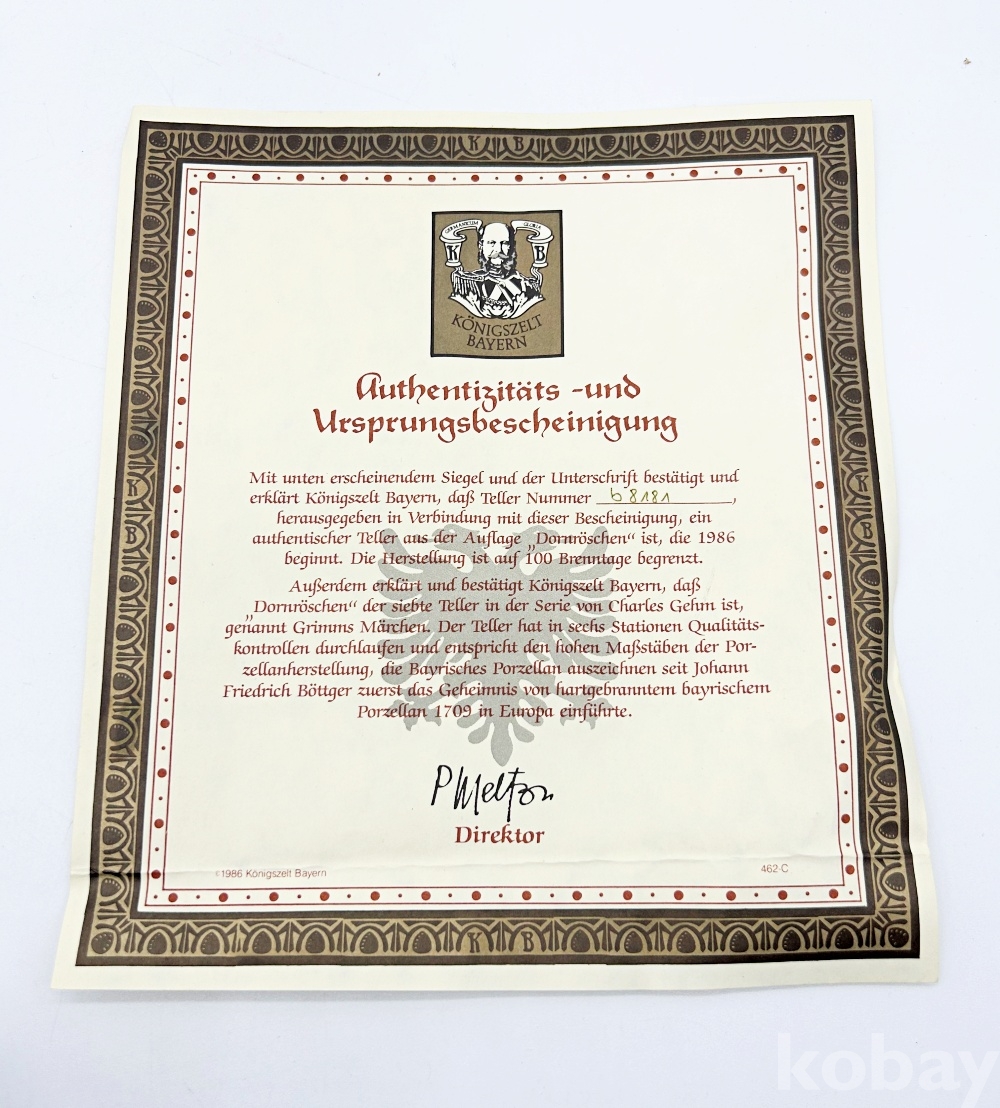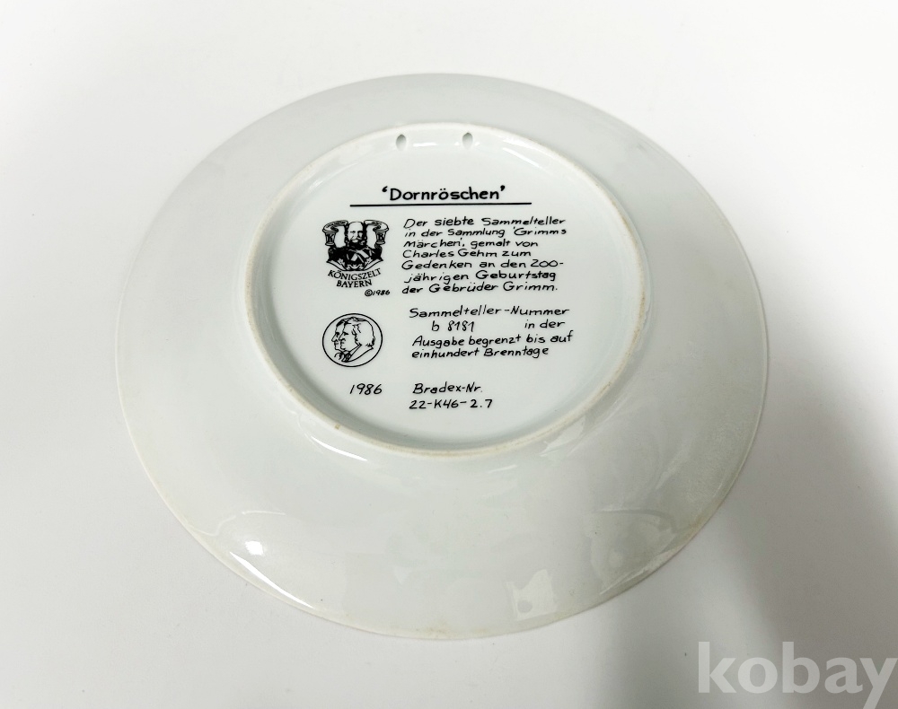 상품설명 | 쾨니히스첼트 바이에른에서 한정판으로 제작한 그림 형제 탄생 200주년 기념 접시이다. 독일 아티스트 찰스 겜(Charles Gehm)의 그림 형제 동화 시리즈 중 7번째 접시로 '잠자는 숲속의 공주(Dornröschen)' 속 장면이 그러져 있다. 박스 24.5 x 24 cm, 접시 20.2 x 20.2 cm / 보증서 1부, 설명서 3부, 영수증 1부 | ||