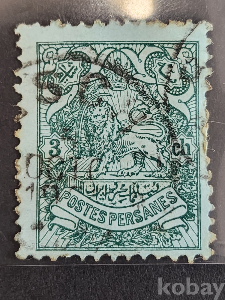 이 우표는 카자르 왕조 시기의 Lion & Sun(사자와 태양) 문장이 중심 도안으로 사용된 클래식 이란 우표입니다.