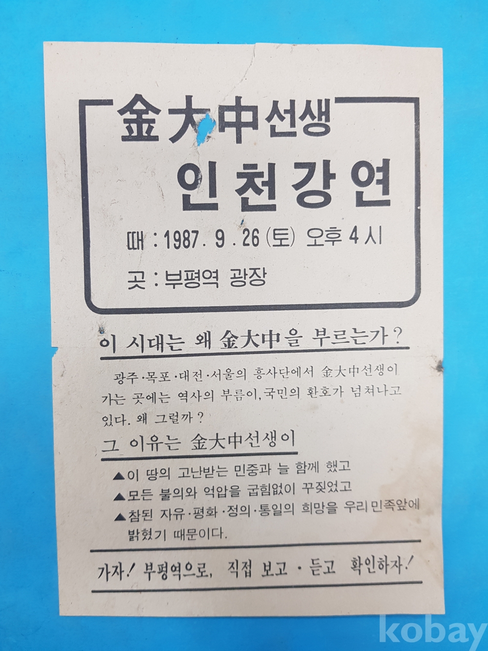 13대 대통령선거 자료 (김대중선생 인천강연 전단지) 1987.9.26. (토) 오후4시. 곳; 부평역 광장