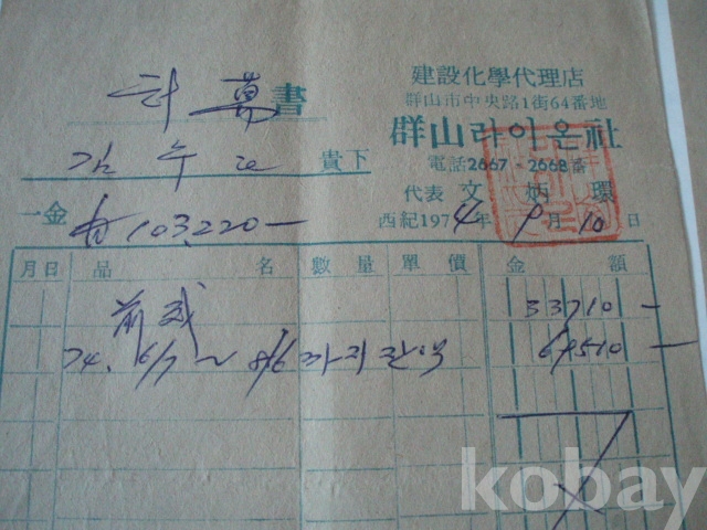 군산 라이온사 - 계산서 (3매일괄, 1974년)