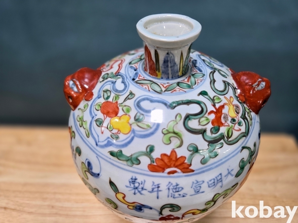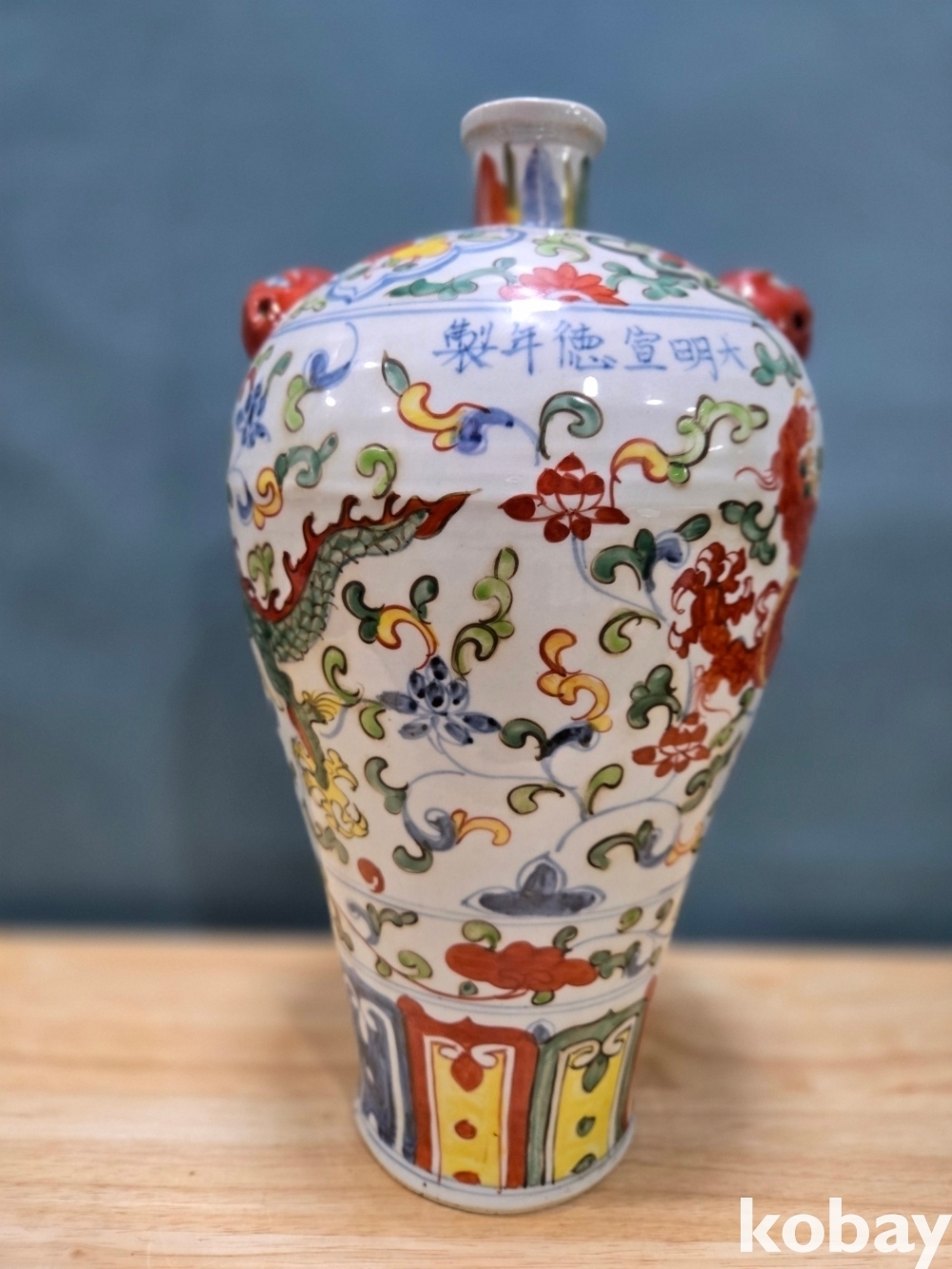 화려한 색상에 용 두마리 표현 매병 도자기 입니다.