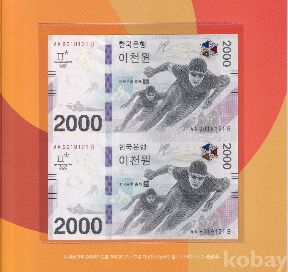- 2018년 평창 올림픽기념 2,000원 초판 AAB 9018121 / AAB 9019121 - 2연결권 미사용 지폐 입니다.