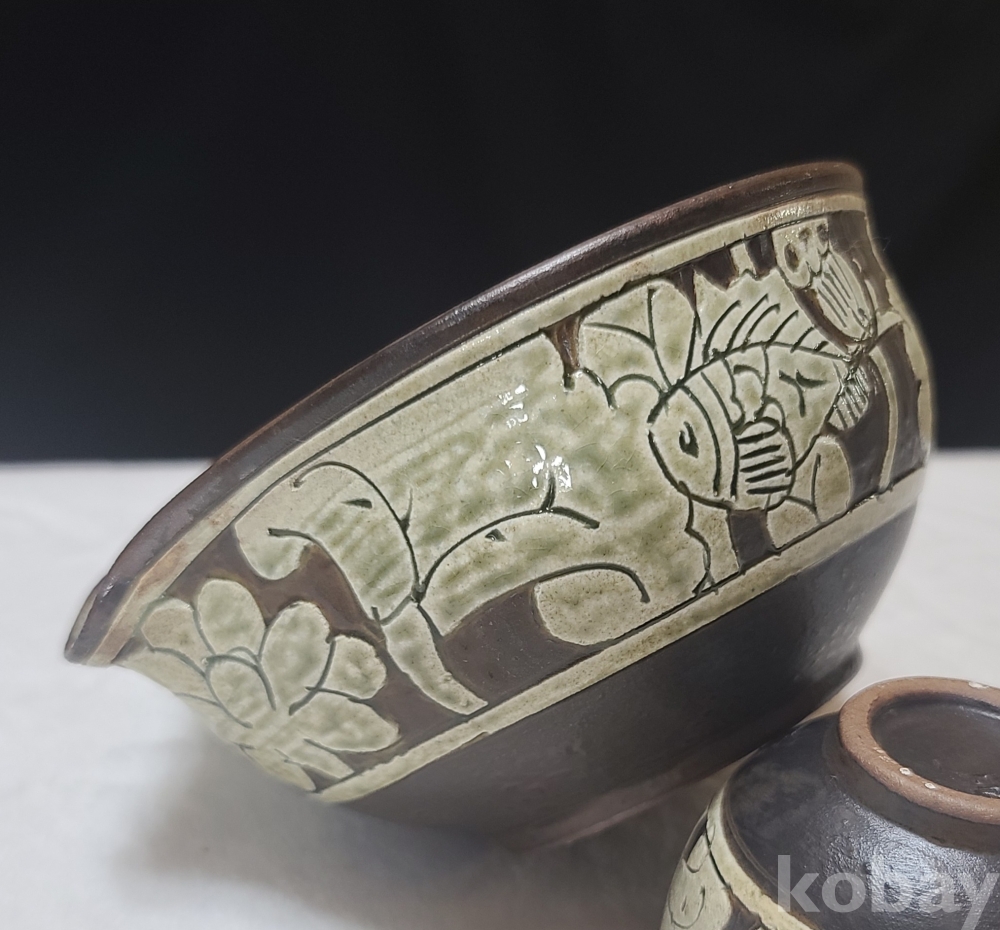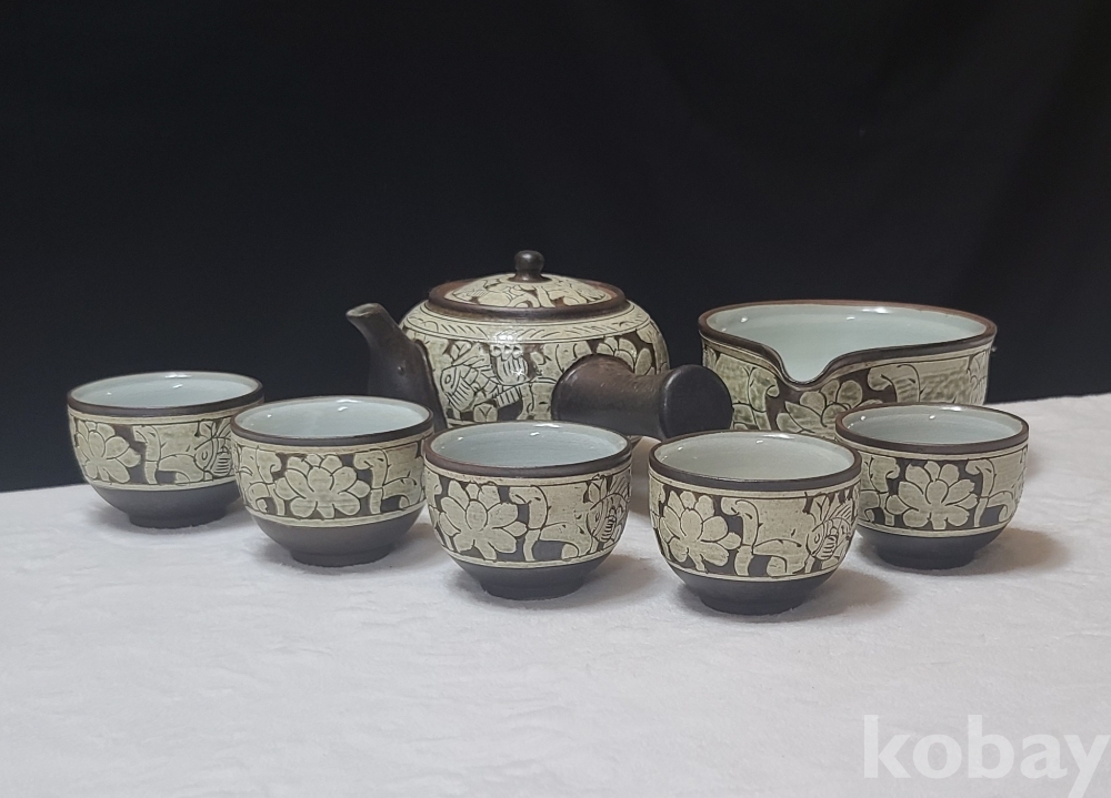 경기도 이천의 유명중견도예가이시며 다도구장이신 "가천" 송기영 作 "분청박지 연화어문다기세트" 입니다.